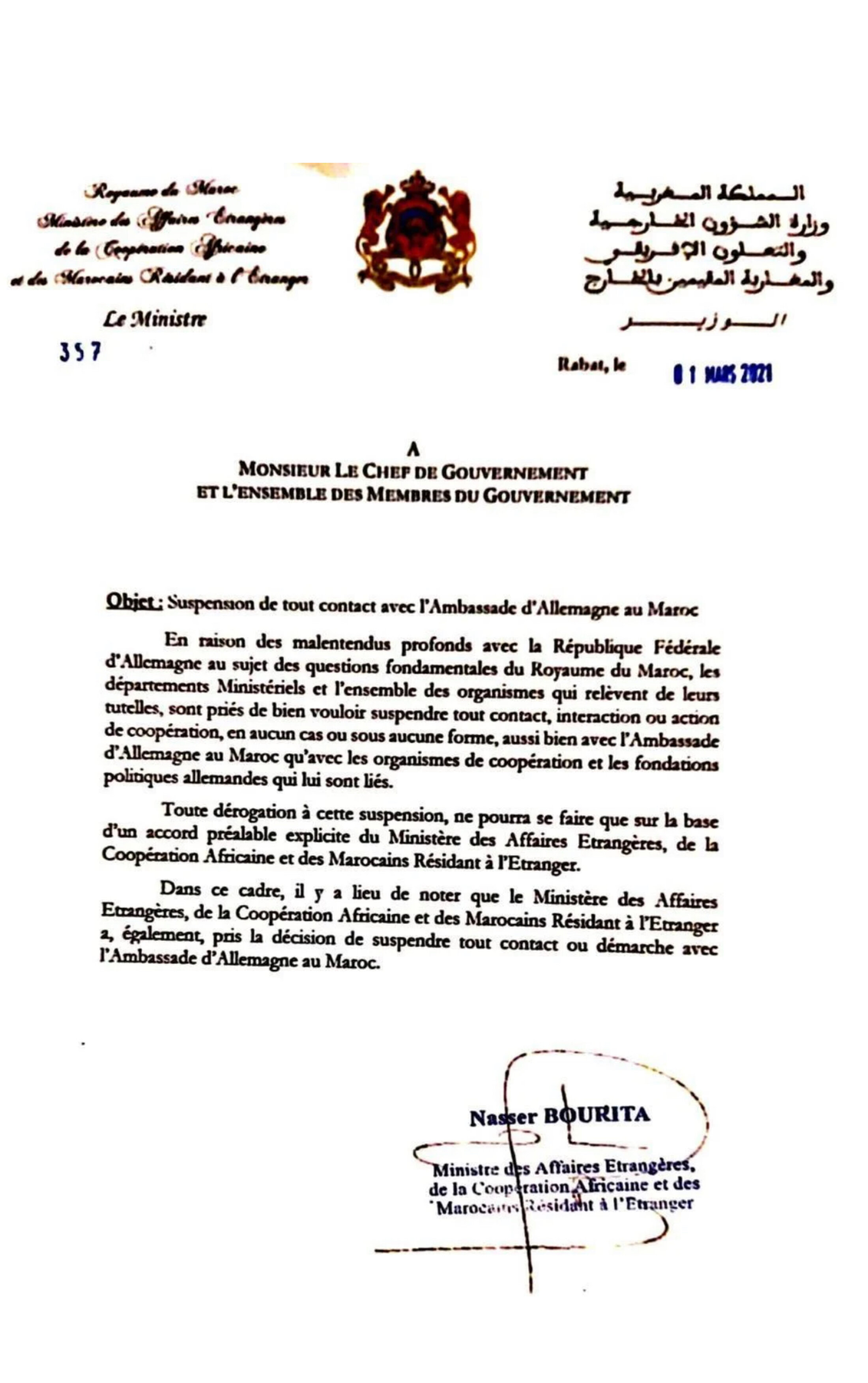“En raison des malentendus profonds avec la République Fédérale d'Allemagne au sujet des questions fondamentales du Royaume du Maroc, les départements Ministériels et l'ensemble des organismes qui relèvent de leurs tutelles, sont priés de bien vouloir suspendre tout contact, interaction ou action de coopération, en aucun cas ou sous aucune forme, aussi bien avec l'Ambassade d'Allemagne au Maroc qu'avec les organismes de coopération et les fondations politiques allemandes qui lui sont liés.