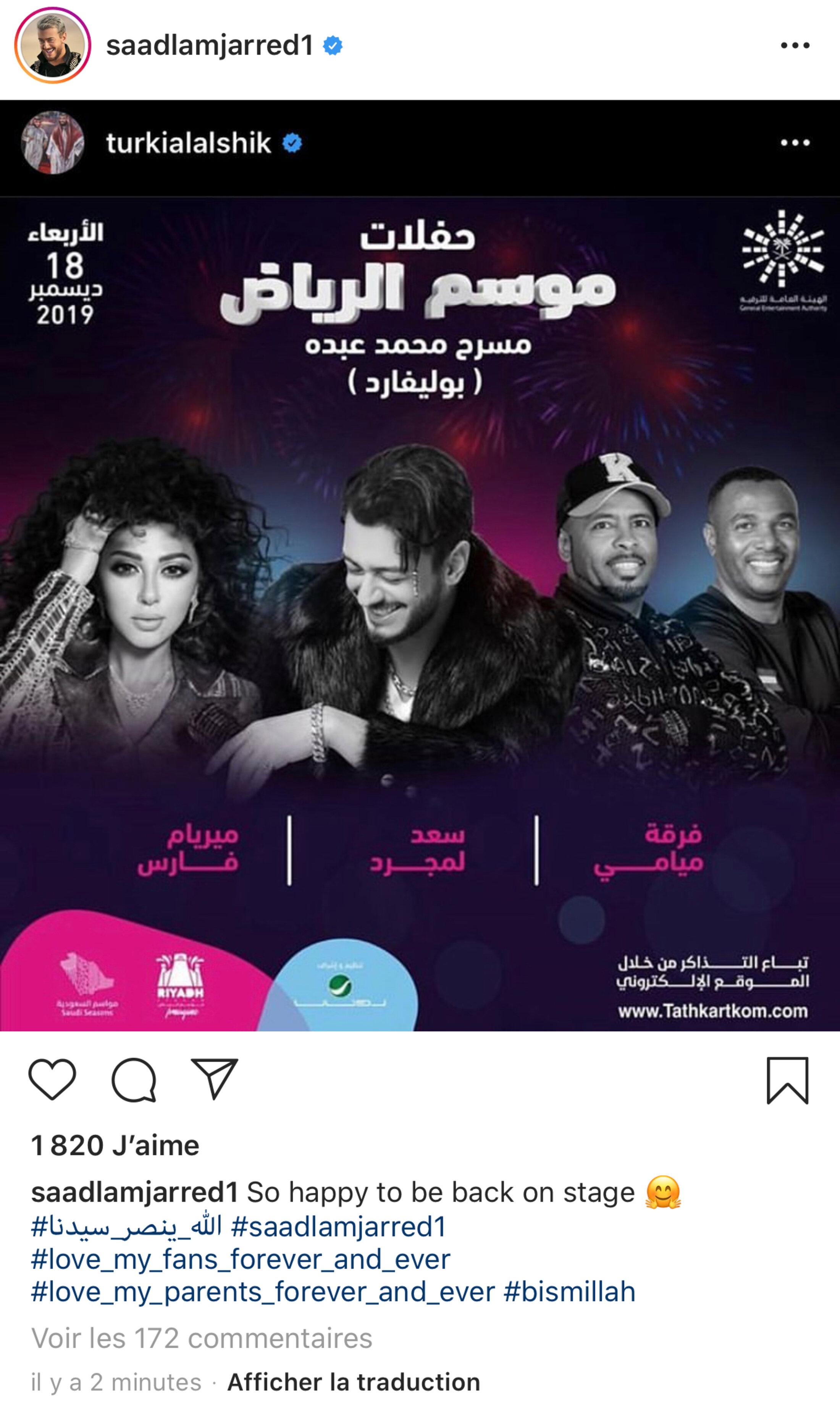 C’est officiel : Saad Lamjarred sera présent au festival Riyadh Season aux côtés de la chanteuse Myriam Fares et du groupe Miami Band. Le chanteur vient de le confirmer sur sa page Instagram.
