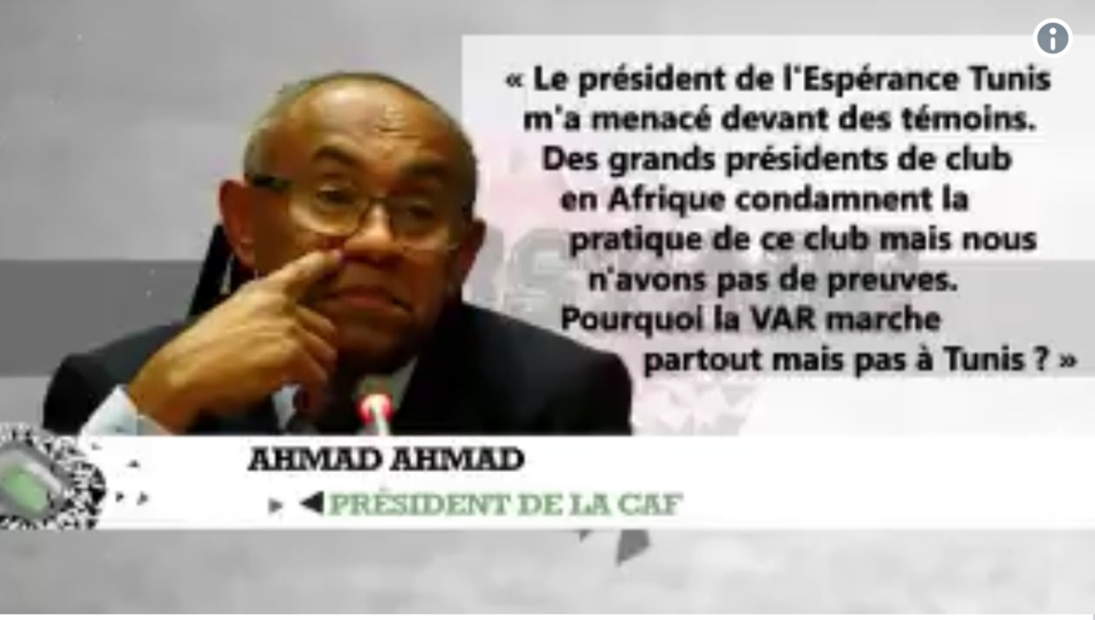 Ahmad Ahmad affirme avoir été menacé devant des témoins par le président de l’EST Hamdi Meddeb à l’occasion de la finale ayant opposé le WAC de Casablanca au club tunisien.