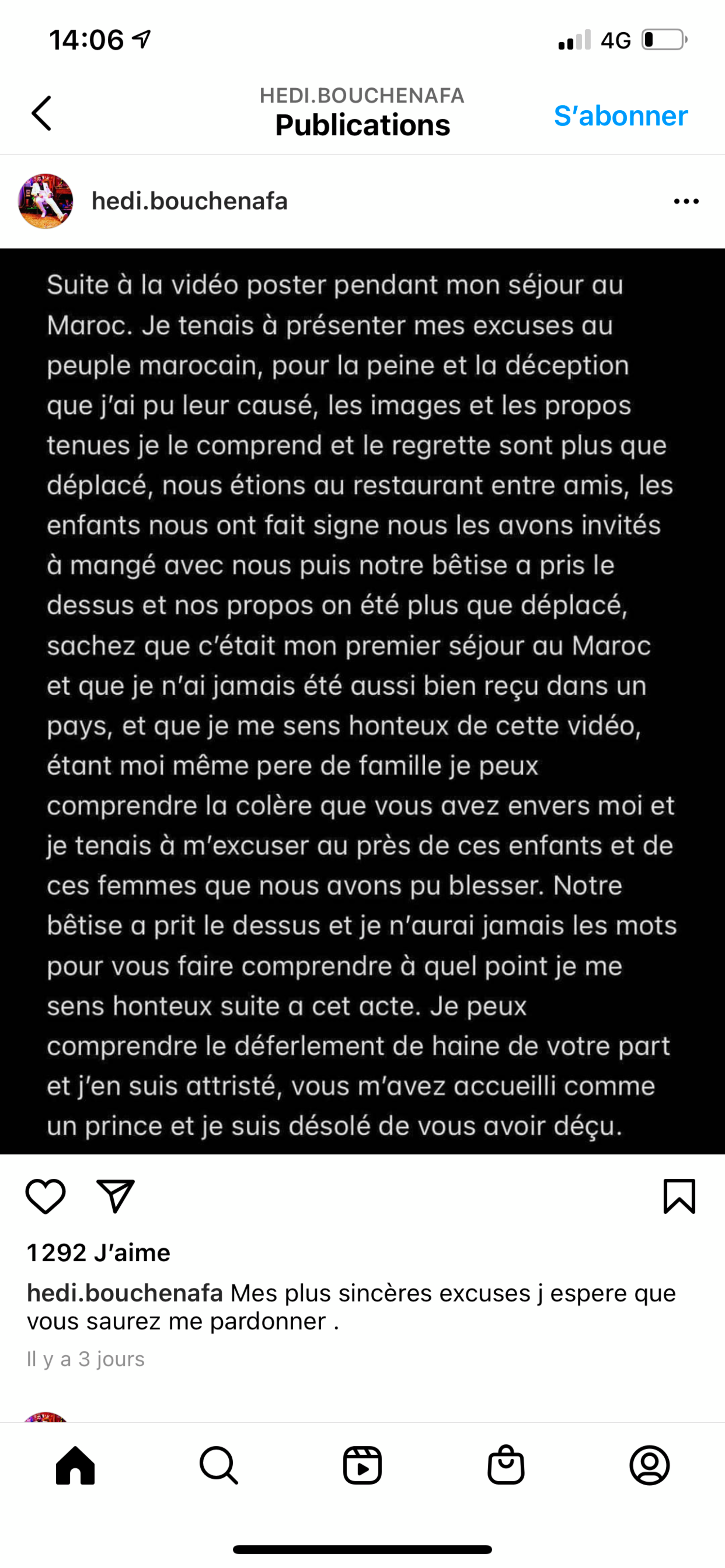 Hedi Bouchenafa publie sur sa page Instagram un long texte (truffé d’erreurs de grammaire, de syntaxe et d’orthographe) où il présente ses excuses: