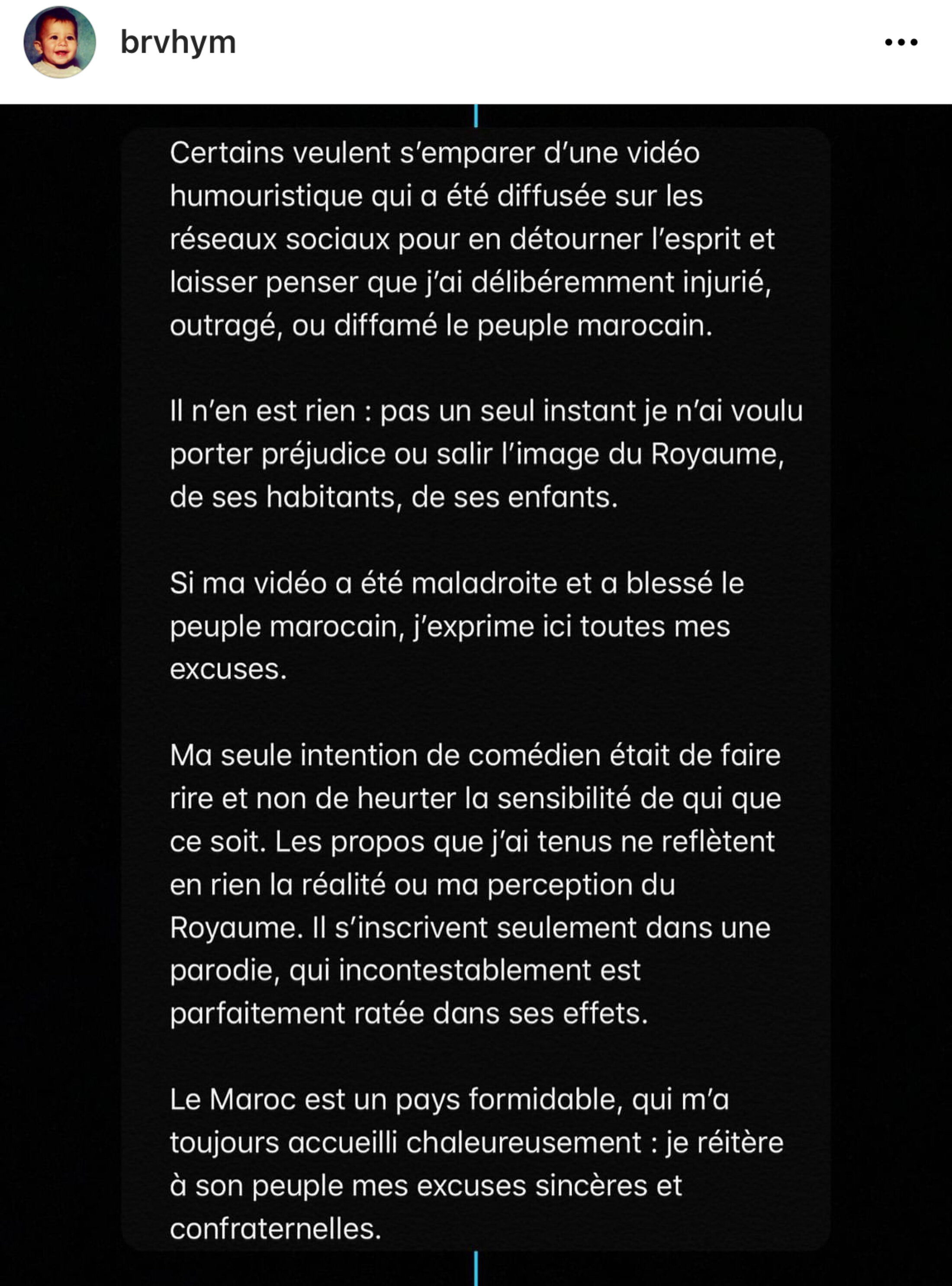 « Certains veulent s'emparer d'une vidéo humouristique qui a été diffusée sur les réseaux sociaux pour en détourner l'esprit et laisser penser que j'ai délibéremment injurié, outragé, ou diffamé le peuple marocain. Il n'en est rien : pas un seul instant je n'ai voulu porter préjudice ou salir l'image du Royaume, de ses habitants, de ses enfants. Si ma vidéo a été maladroite a blessé le peuple marocain, j'exprime ici toutes mes excuses. Ma seule intention de comédien était de faire rire et non de heurter la sensibilité de qui que ce soit. »