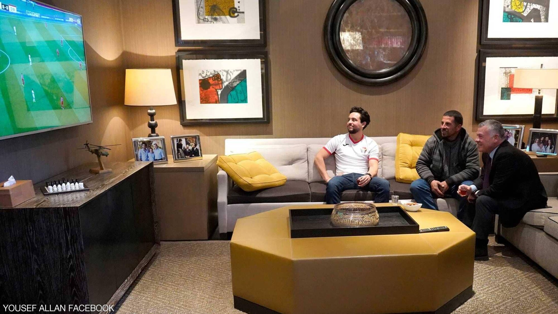 Sur cette photo, on voit le Roi Abdallah II, l'héritier du Trône et l'agent de propreté Khaled Echomouli assis dans un salon en train de regarder ensemble un match de football opposant l'équipe de Syrie à celle de la Jordanie, cette dernière sortie victorieuse sur un score de deux à zéro à l'issue de la rencontre.