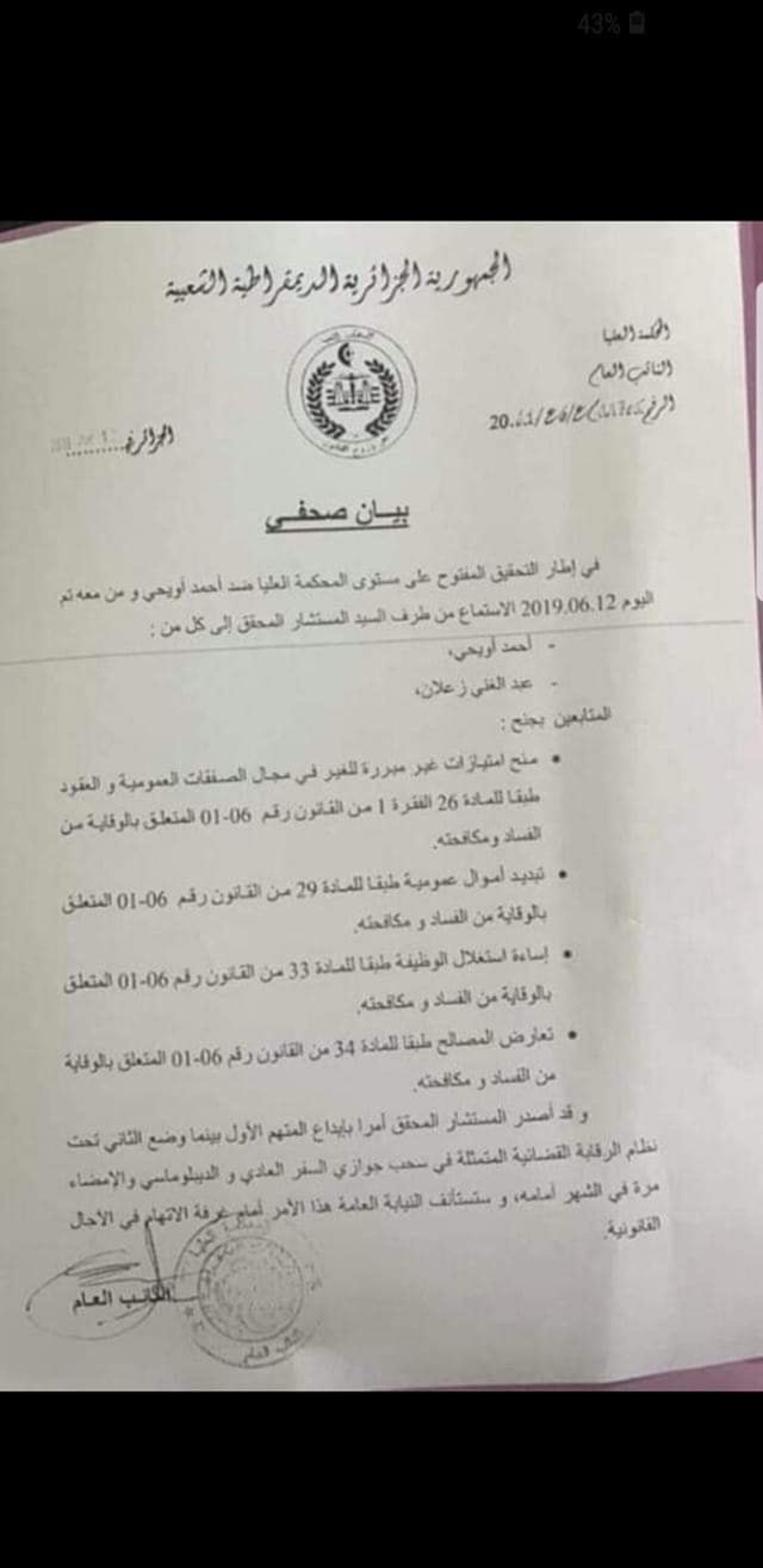 Concomitamment à cela, L'ancien ministre des Travaux publics, Abdelghani Zaalane, a été placé sous contrôle judiciaire pour des faits identiques de corruption en liens avec des contrats publics.