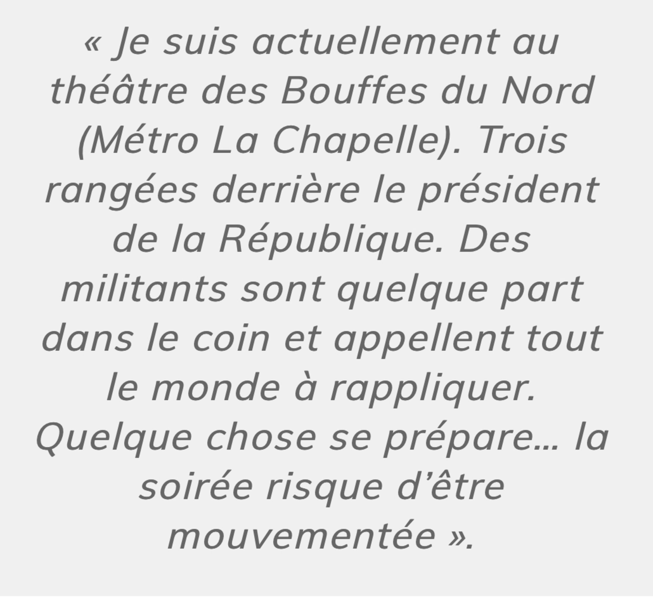 « Je suis actuellement au théâtre des bouffes du Nord (Métro La Chapelle) 3 rangées derrière le président de la république. Des militants sont quelque part dans le coin et appelle tout le monde à rappliquer. Quelque chose se prépare... la soirée risque d’être mouvementée. »