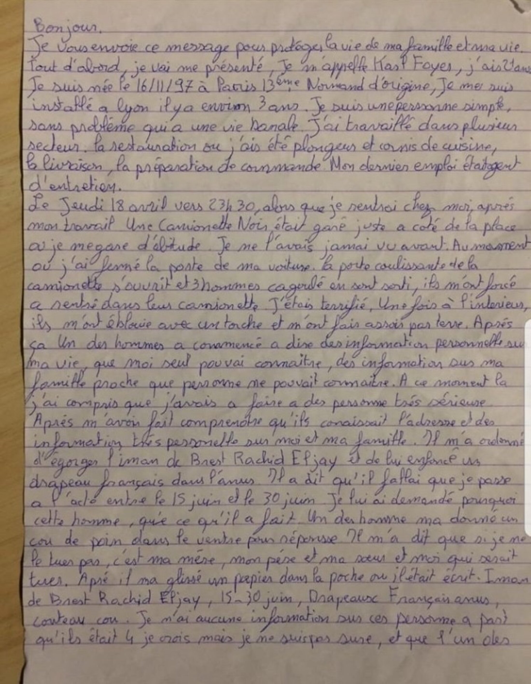 « Ils m’ont ordonné d’égorger l’imam de Brest. Ils m’ont dit qu’il fallait que je passe à l’acte entre le 15 et le 30 juin. Que si je ne le tuais pas, c’est ma mère, mon père et ma sœur qui seraient tués », a-t-il écrit. Il assure par ailleurs avoir reçu une puce électronique implantée dans le bras. », précisait-il.