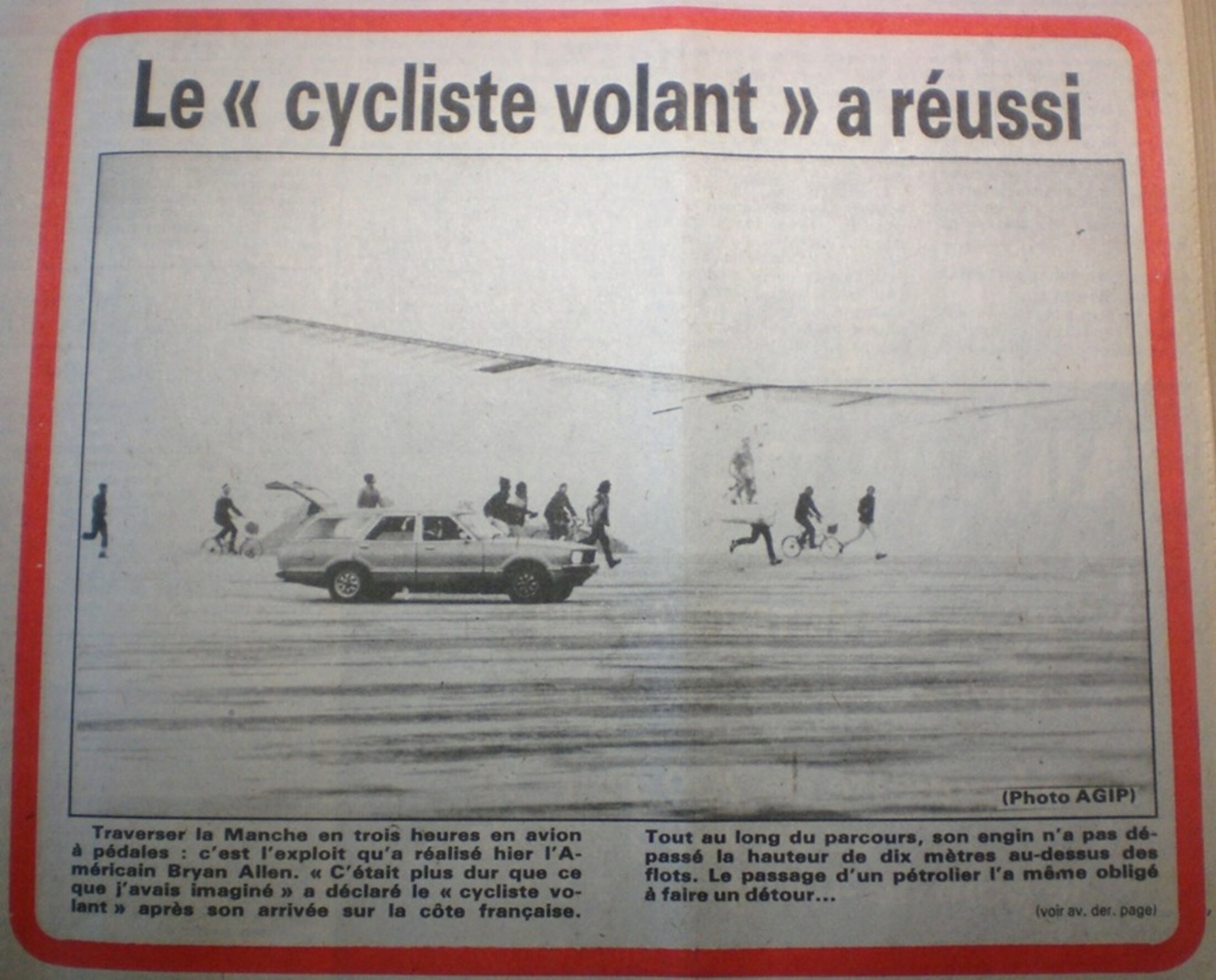 On le surnomme "le cycliste volant" : le 12 juin 1979, Bryan Allen parvient à franchir la Manche en moins de 3 heures à bord d'un curieux engin mû à la force du pédalage, le "Gossamer Albatross".