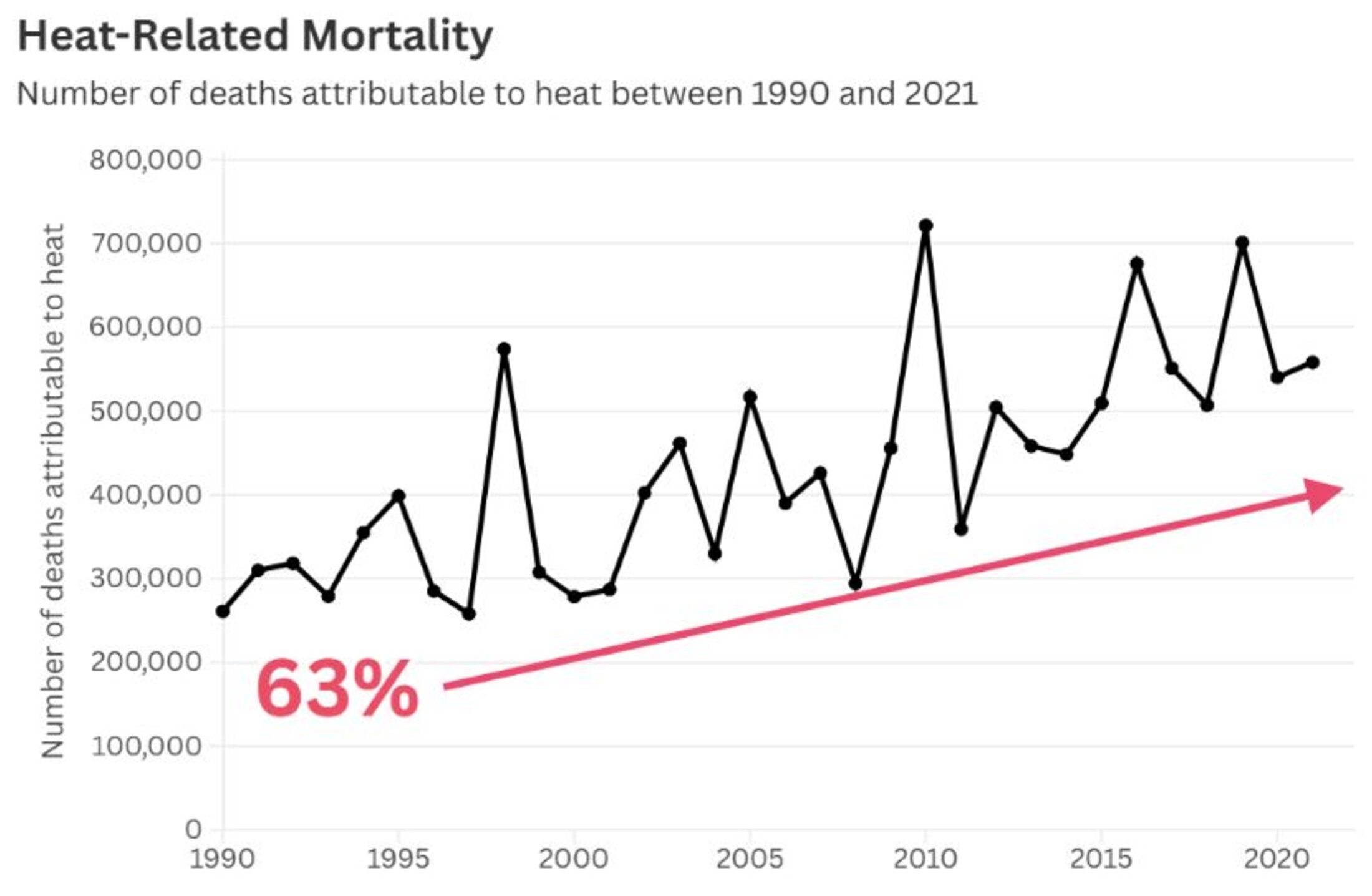 Le premier effet du réchauffement climatique, le plus simple à observer en terme d’impact sur la santé humaine, est la multiplication des canicules. Le nombre de morts directement imputables aux vagues de chaleur a augmenté de 63% depuis les années 1990, atteignant un total de 546 000 décès par an en moyenne, un par minute. En 2024, une personne était exposée en moyenne à 16 jours de niveaux de chaleur dangereux qui ne se seraient pas produits en l’absence de changements climatiques. Les personnes à risques (nourrissons, personnes âgées, maladies chroniques, femmes enceintes) ont été confrontés à plus de 20 jours de canicule par personne au total, soit quatre fois plus qu’au cours des 20 dernières années.