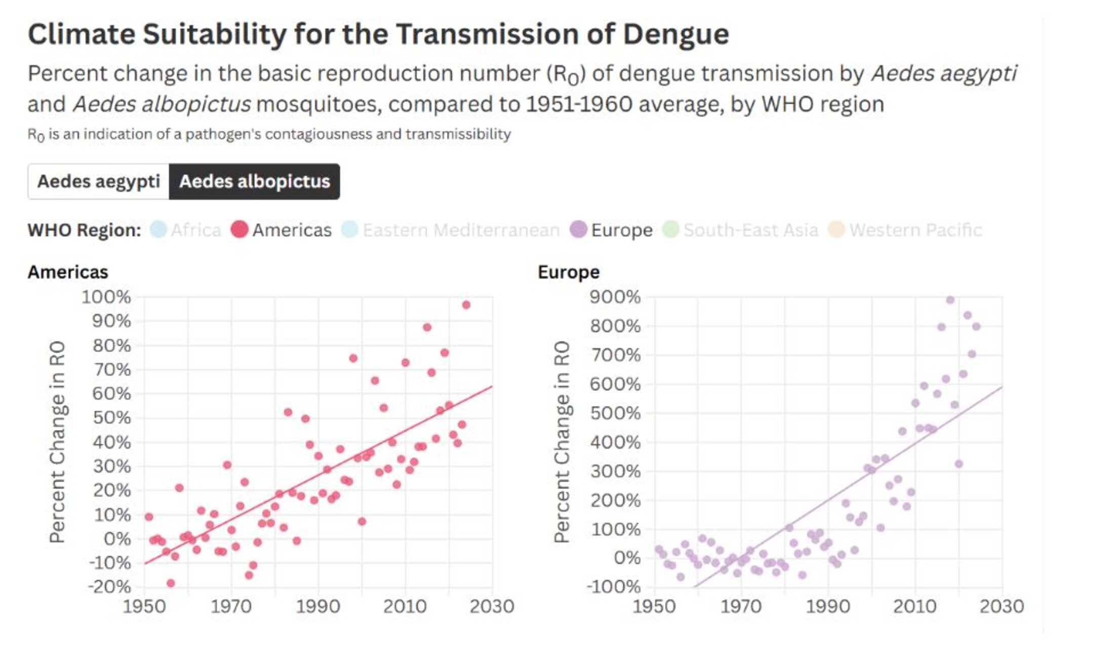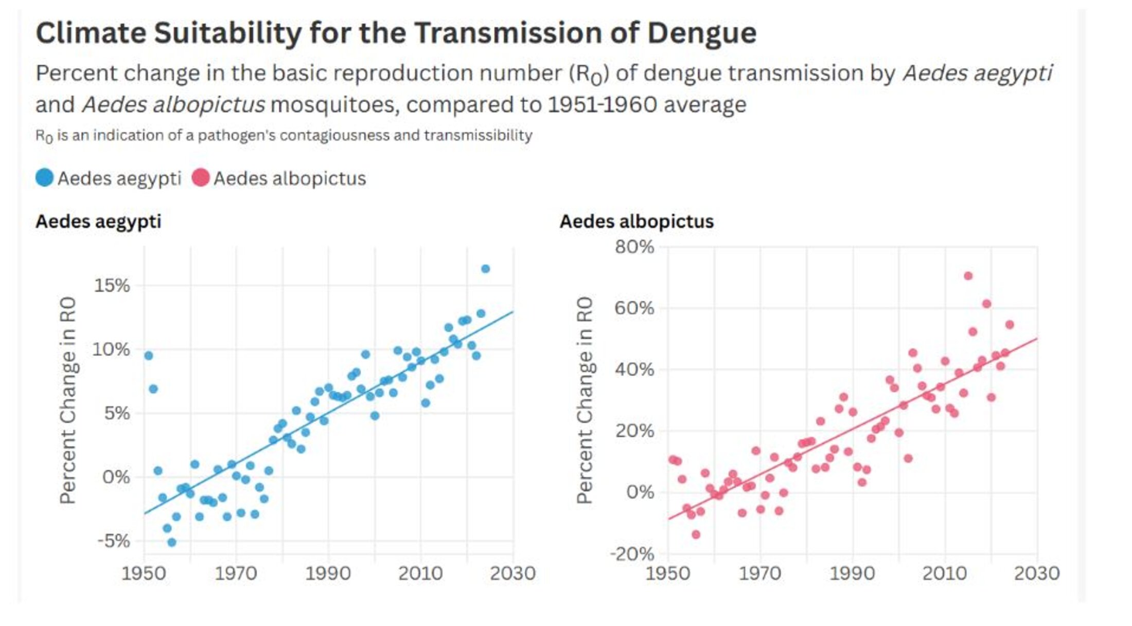 Les conditions climatiques augmentent également les risques de transmission de maladies mortelles. La dengue a touché 7,6 millions de personnes en 2024 (16 000 cas sévères et plus de 3000 décès), soit une augmentation de 48% de la forme Ae albopictus et 12% de Ae aegypti, en comparaison avec la période 1951-1960. La même tendance à l’augmentation est observée avec les virus chikungunya (+48%) et zika, la malaria (+13%, 500 000 morts par an, affectant majoritairement enfants et femmes enceintes), la leishmaniose (+29%, parasites causant la mort de 20 000 à 40 000 individus par an), les maladies liées aux tiques (+7% pour la tique R sanguineus, +3% pour la Hyalomma, soit 364 millions de nouvelles personnes infectées et donc à risque).