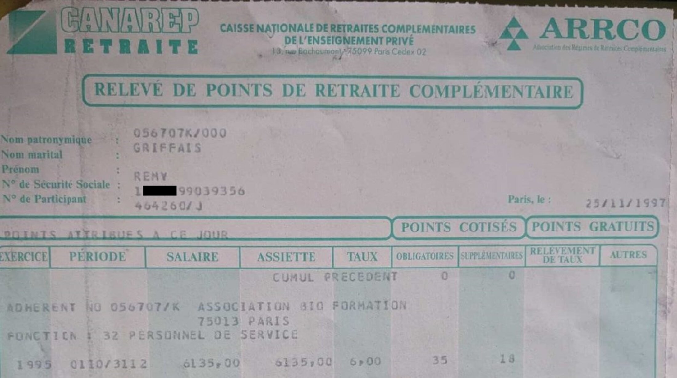 Le relevé de points de la CANAREP au nom de GRIFFAIS REMY, avec le NIR 1 xx xx 99 039 356, indique pour 1995 les mêmes informations que celles du relevé de l'AGIRC-ARRCO : employeur (ASSOCIATION BIO FORMATION), période (01/10 - 31/12). Bien que le NIR sur le relevé CANAREP soit différent en raison d'une erreur de transcription, les données sont qualitativement identiques, ce qui montre que l'AGIRC-ARRCO avait identifié cette erreur. Si tel n'était pas le cas, les informations issues de la CANAREP n'auraient pas été reprises.