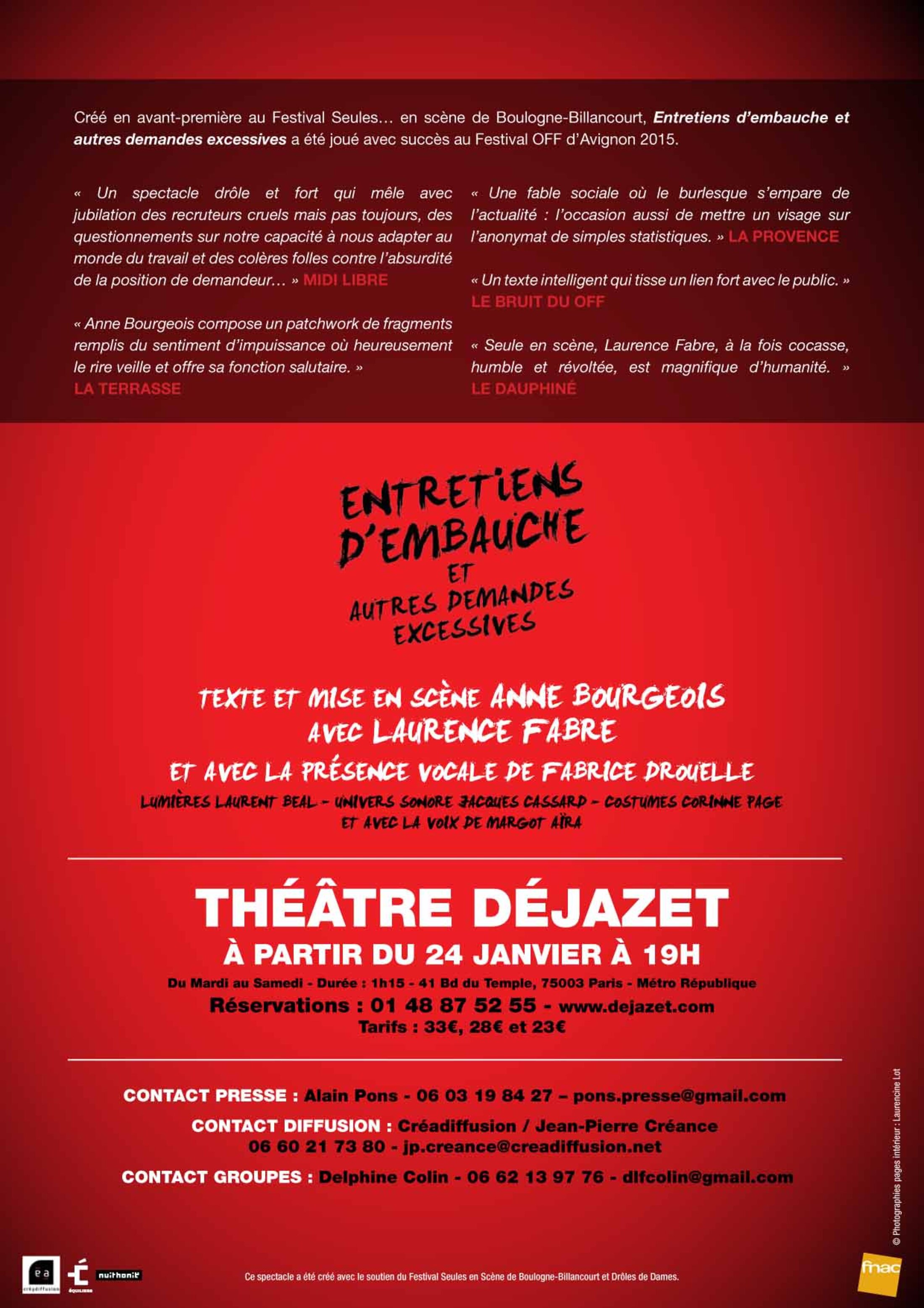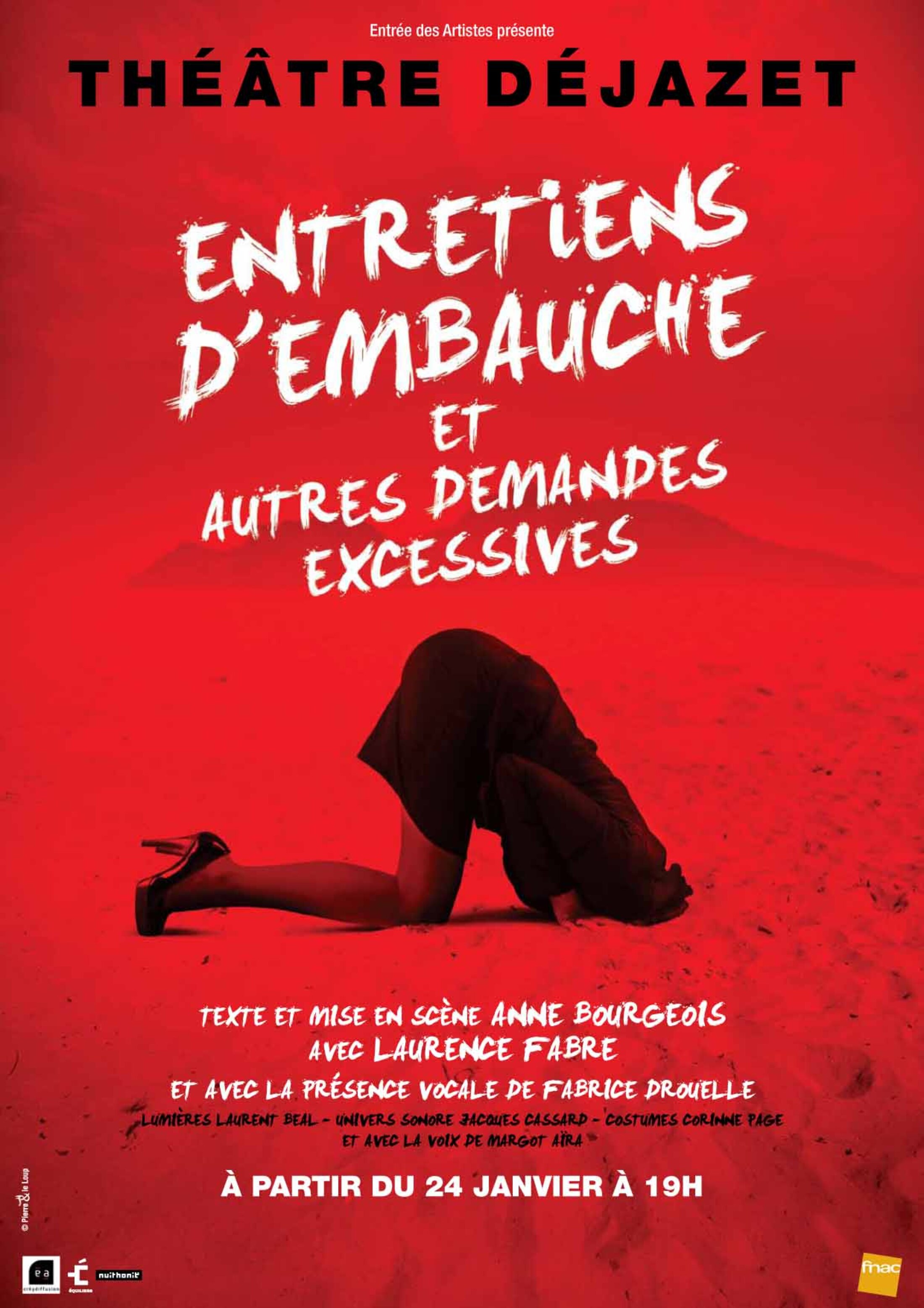 En huit tableaux d'un one women show sans l'once d'un temps mort, l'actrice, Laurence Fabre, l'écrivain scénariste Anne Bourgeois et le ," voix offiste" Fabrice Drouelle, ou devrions-nous dire, le "voix offmestre", nous plongent au coeur de " Entretiens d'embauche et autres demandes excessives". Les demandes? La demande? Elle est au coeur du mot précarité, lequel va jusqu'à la prière (precario, precatus, precarius), un mot qui n'est jamais prononcé mais qui est un des lekton de la pièce. Pourquoi, sous prétexte que le scénario, et la seule actrice en chair, soient drôles, hilarantes, émouvantes, touchantes, pourquoi donc se refuser à certaines références ? Demander comporte toujours une doublure. Dit autrement, on est toujours doublé par sa demande. Doublé par ces demandes sans objet que sont la haine, l'amour, et l'ignorance ( Jacques Lacan, La psychanalyse vraie, et la fausse) Toutes trois tournoient dans ce théâtre de la vie que font surgir pour nous l'auteur et l'actrice. Le monde du travail exige aujourd'hui une présence " désaffectivée" pour reprendre ce néologisme d'Anne Bourgeois. C'est le "savoir être", nouveau "devoir être" qui nous somme aujourd'hui de défalquer de notre présence toute affectivité. " Enlever l'affect, enlever l'émotion [...] Il faut renoncer à des choses de soi", dixit le texte. Il ne sera toutefois pas question de renonciation, de démission, ou encore de complaisance, ni de revendication, dans cette confrontation à l'humiliation, au rabaissement, à la déstabilisation. Mais d'affirmation de soi, pour le dire ainsi.