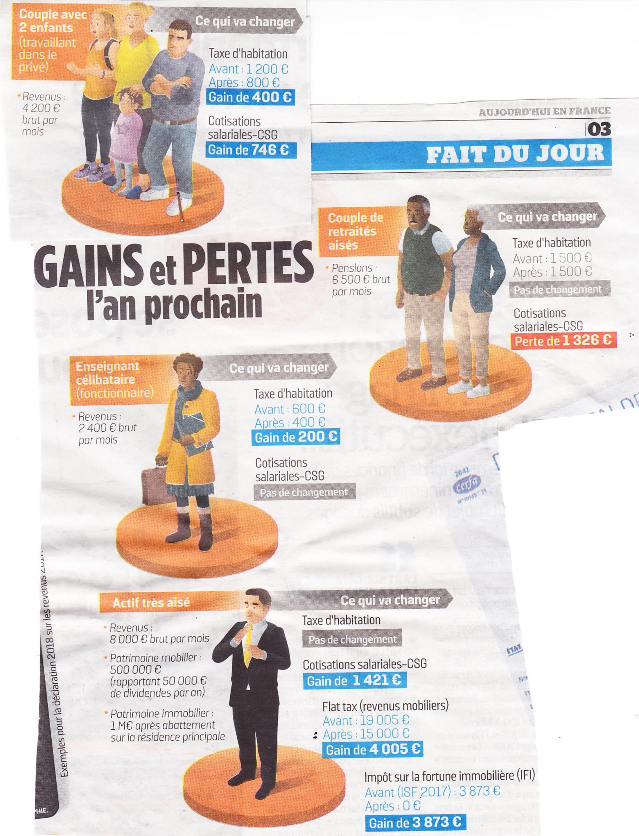 Le reportage sur les groupes LIDL et FREE sur France 2 du mardi 26 septembre 2017 vient démentir ce que notre président voudrait instaurer : le libéralisme économique et "en même temps" la liberté individuelle et politique. Dans ce contexte, la main invisible d'Adam Smith prend aussi un tout autre sens, qui est celui de l'humiliation que subit quotidiennement le salarié. C'est l'impunité permise à ces agissements qui ont lieu dans l'univers confiné des grands groupes, et qui sont invisibles pour l'extérieur, qui rend possible qu'au final, la politique économique, tablant sur ce mutisme imposé, puisse établir ce déséquilibre tout à fait évident sur cette page du journal Aujourd'hui en France. Car ce n'est pas dans la rue que se joue le rapport de force, mais à l'intérieur de l'entreprise qu'elle soit publique ou privée.