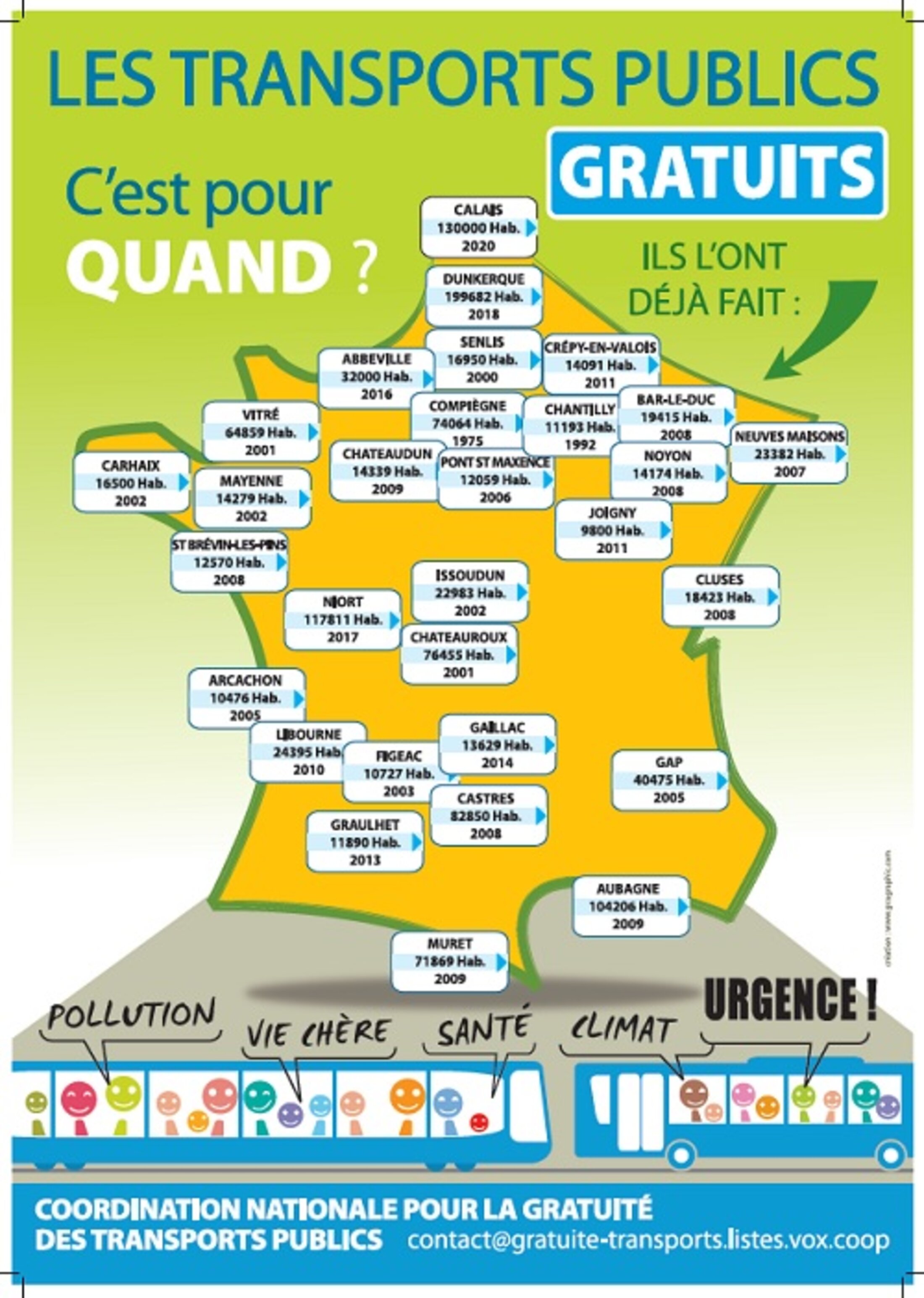 À l’initiative de : Collectif pour la gratuité des transports publics dans l’agglomération grenobloise, Collectif agglomération rouennaise pour les transports gratuits, Collectif nancéien pour une régie publique des transports urbains et pour leur accès gratuit, Collectif transport gratuit en Pays d'Aubagne et de l'Étoile, Association « se déplacer en liberté » (ASDEL Aubagne), Collectif porté par ATTAC Lille-Métropole, Collectif lyonnais pour la gratuité des transports en commun, Collectif gratuité des transports Toulouse, Collectif chambérien pour la gratuité des services publics locaux, Collectif messin pour la gratuité des transports en commun, Collectif des transports gratuits de Clermont-Fd Métropole, Collectif Bus gratuit pour Lorient Agglomération.