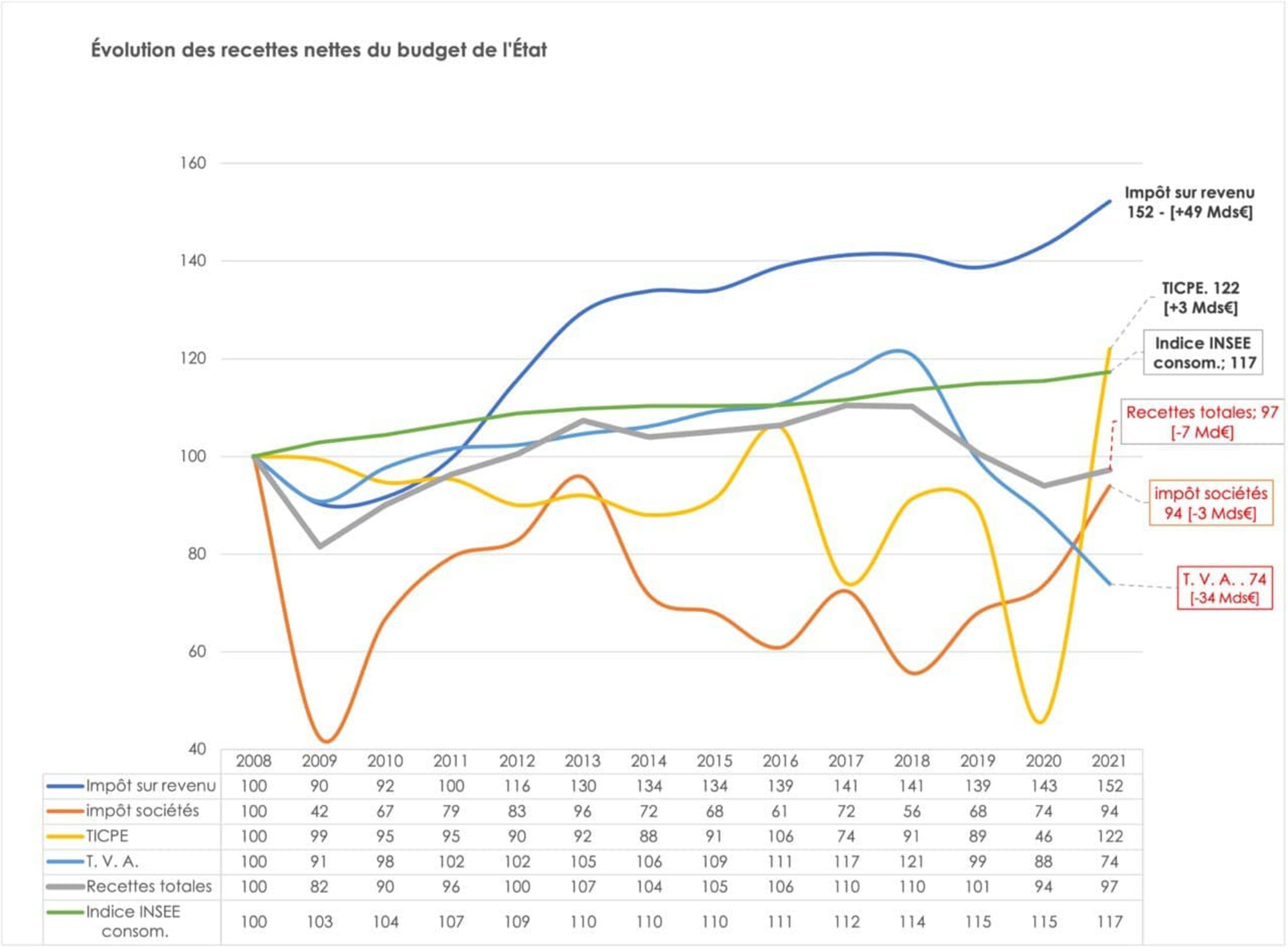 Cependant, parfois, la Cour des Comptes est prise d'une sorte de bouffée de chaleur en élaborant son rapport annuel. Ainsi, son commentaire est-il éloquent, page 11 de la note d’exécution budgétaire 2021 - recettes fiscales de l’État (Cour des Comptes) : « Le produit de la quasi-totalité des lignes de recettes augmente à l’exception de la TVA qui fait l’objet de transferts d’ampleur inédite : à partir de 2021, près de la moitié de la TVA nette est transférée à d’autres administrations publiques que l’État (54 Md€ à la sécurité sociale et 37 Md€ aux collectivités locales) et cette taxe ne représente en 2021 plus qu’un tiers des recettes de l’État »