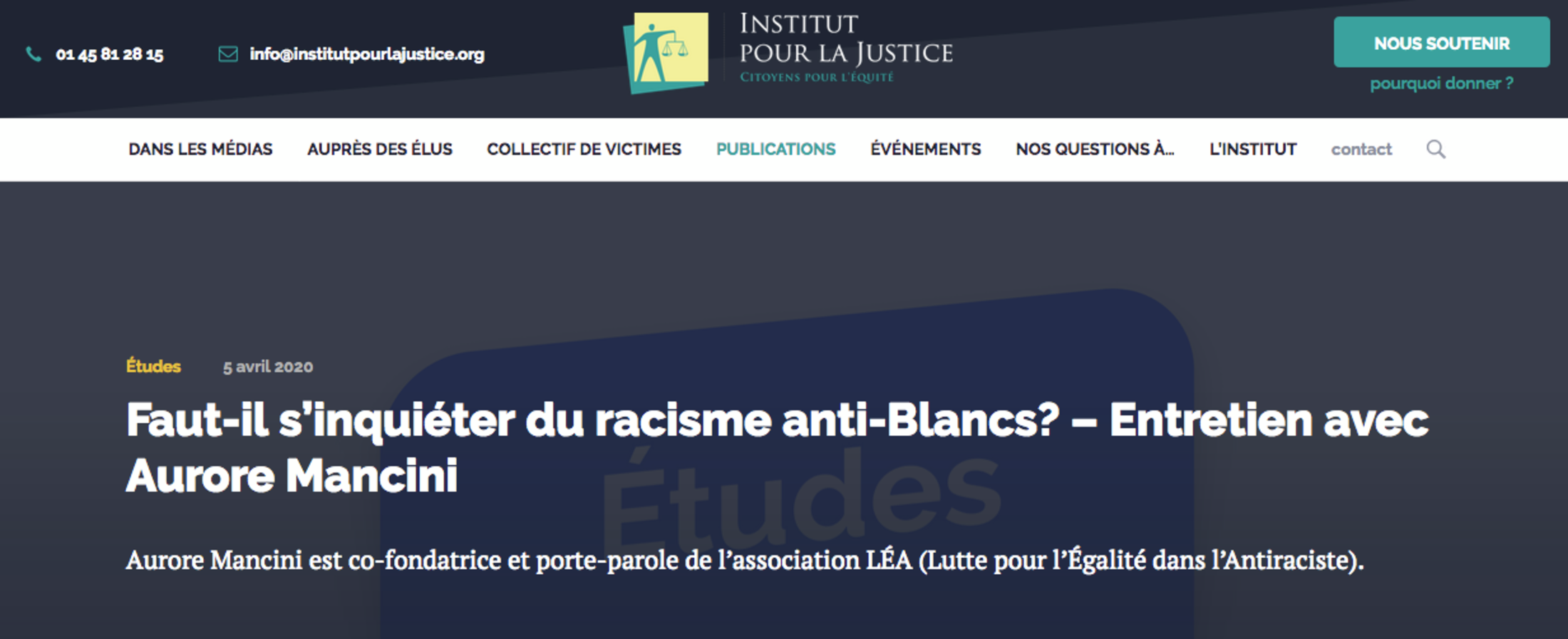Concernant l’Institut pour la justice, qui publie un entretien avec Aurore Mancini, vice-présidente de l’association L.E.A (Président Laurent de Béchade), une plateforme raciste contre le racisme anti-blanc. Le média SLATE, était relaxé en 2015, par la 14e Chambre correctionnelle du Tribunal de Grande Instance de Nanterre dans le cadre d’une plainte pour diffamation déposée par l’Institut pour la justice (IPJ) contre un article de 2011 : Ce qui se cache derrière l’Institut pour la justice – Contrairement à ce que son nom laisse penser, l’IPJ est en fait une association oscillant entre collectif de victimes et lobby institutionnel.