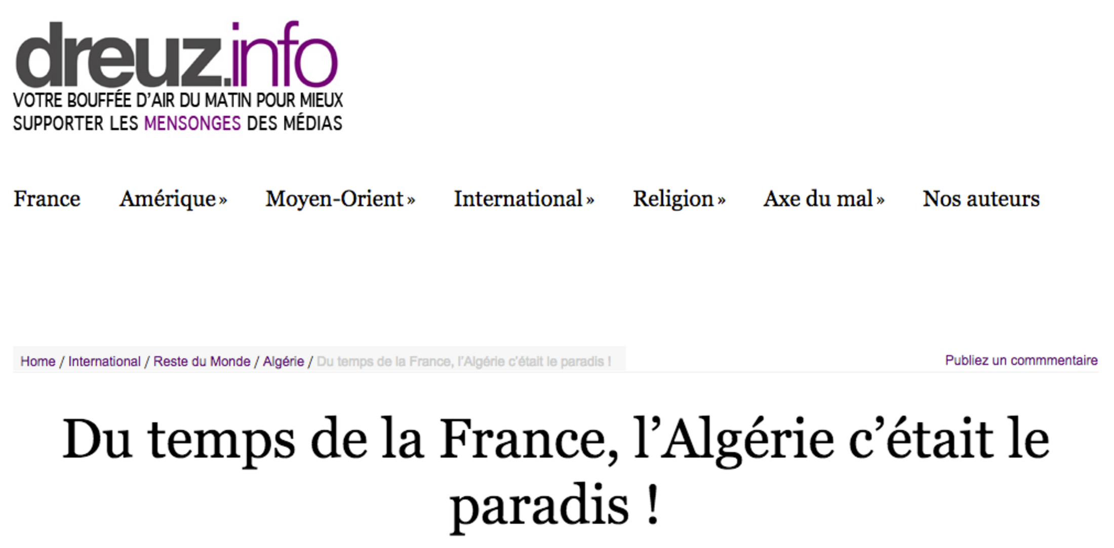 Pour l’extrême droite, l’idée de souveraineté nationale se mélange avec la fierté de l’impérialisme français dans le monde. Le media d’extrême droite Dreuz.info, dans l’article “Du temps de la France, l’Algérie c’était le paradis ! “, manipule le mots d’Hocine Aït Ahmed, révolutionnaire et anticolonialiste algérien, pour ses propres fins idéologiques…