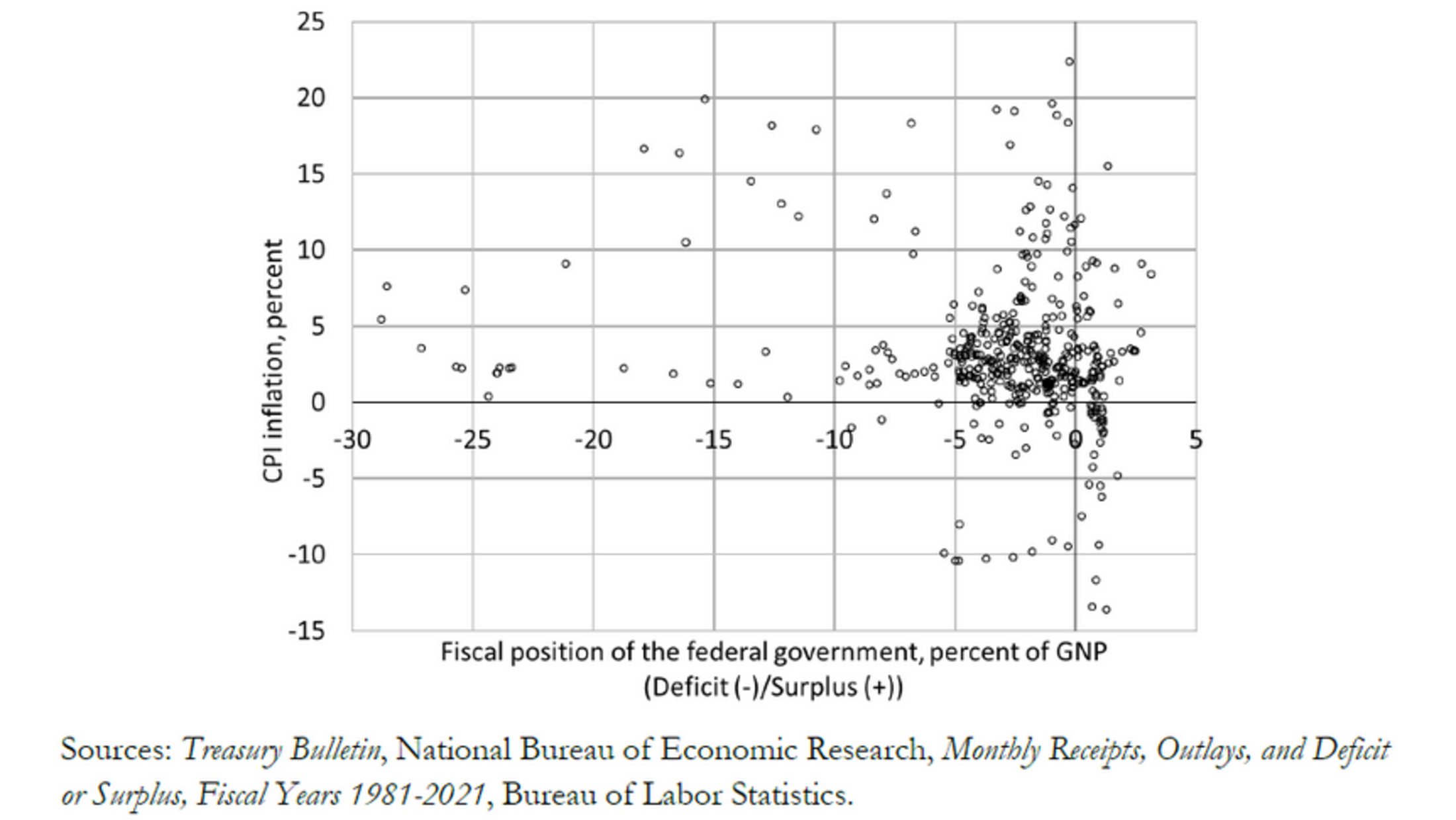 Une critique également souvent entendue se base sur le fait que les déficits publics seraient inflationnistes. Or, la MMT démontre que les déficits publics ne provoquent pas directement d'inflation, car ils n'entraînent pas une hausse automatique des taux d'intérêt. Au contraire, en augmentant les réserves bancaires, ils exercent une pression à la baisse sur les taux, sauf si la banque centrale intervient pour ajuster la liquidité. Cette perspective remet en question l'idée traditionnelle selon laquelle les déficits publics sont intrinsèquement inflationnistes. Et, comme le décrit Eric Tymoigne empiriquement, "Un simple examen des données relatives aux États-Unis montre que l'association automatique des déficits budgétaires à l'inflation n'est pas justifiée."5