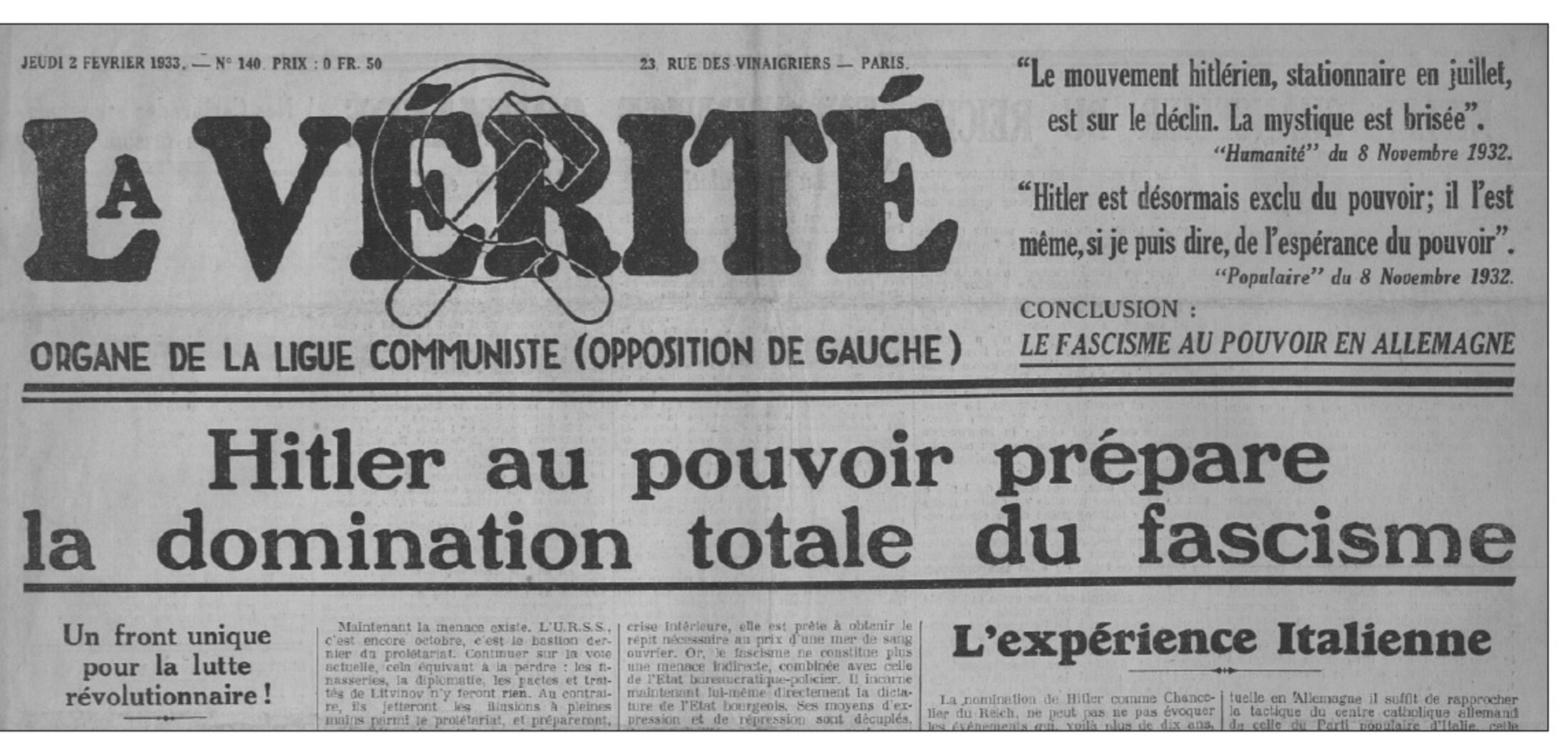 [16] Léon Trotsky, "La victoire d’Hitler signifierait la guerre contre l’URSS" 15 avril 1932, Contre le fascisme, Paris, Syllepse, 1988, texte 16 , p 213.