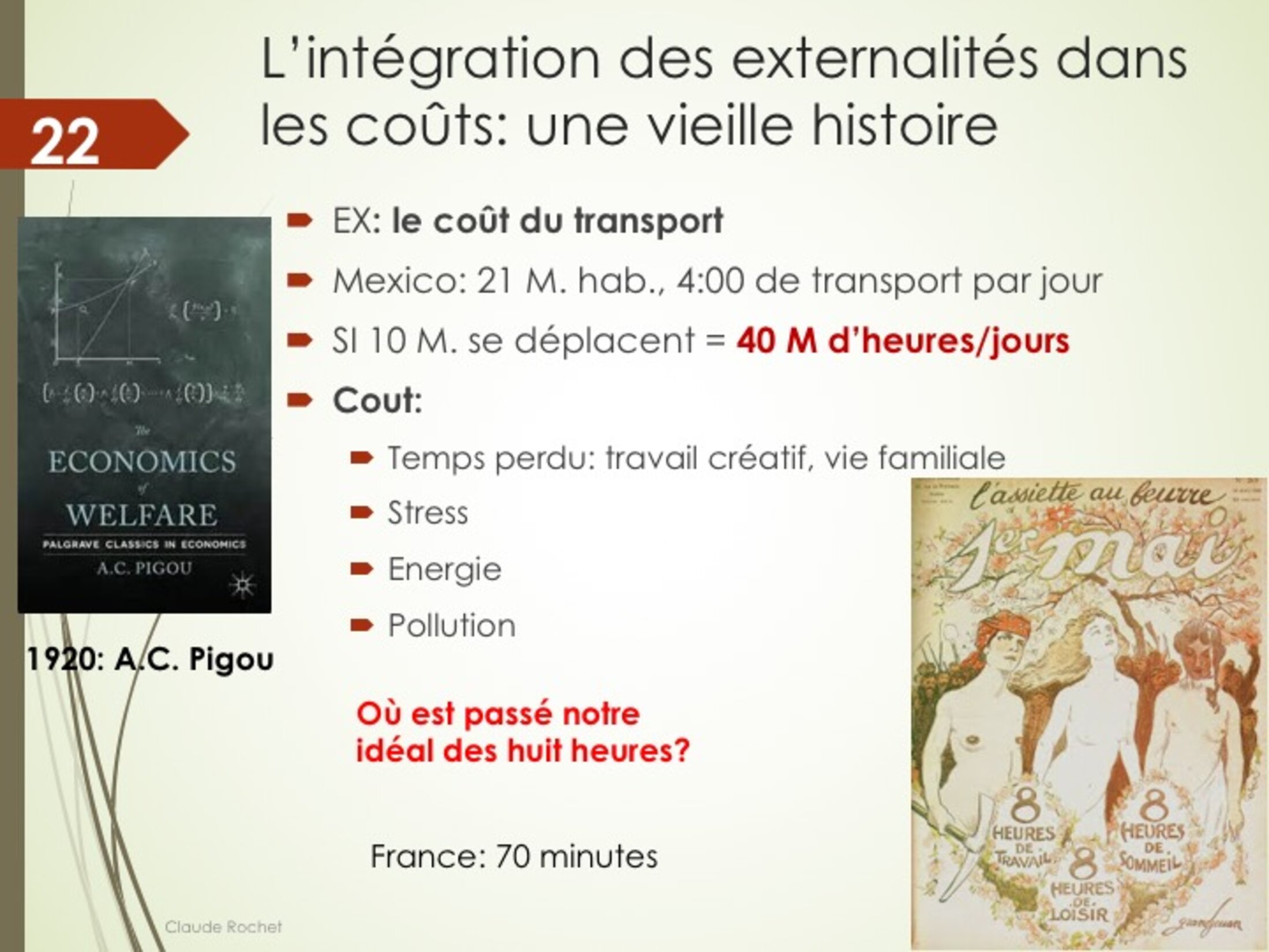 Dés 1920 l’économiste A.C. Pigou proposait d’intégrer les externalités dans le calcul des coûts : On sait que plus une ville est grande plus elle produits de déchets, de pollution, de stress et que la consommation d’énergie croît de manière plus que proportionnelle à la taille. L’historien Paul Bairoch en 1977 évaluait la taille optimale à 300 000 hab. dans les pays industrialisés, 400 000 pour les autres. Cette taille raisonnable permettrait d’architecturer les transports et les relations domiciles –lieu de travail à l’origine de la pollution urbaine, du stress et de la dégradation de la vie sociale. L’intelligence de la smart city n’est pas dans un déluge de technologies mais dans une intelligence de l’architecture de la ville comme système de vie pour privilégier les interactions créatrices et éliminer les autres : l’énergie la moins chère est celle que l’on ne consomme pas parce que l’on a supprimé le besoin. Les technologies nouvelles sont des outils qui permettent de créer de nouvelles configurations urbaines qui peuvent autant générer un big brother totalitaire que de créer une ville humaine et évolutive. Pour cela, c’est une nouvelle comptabilité des coûts publics qui est à inventer : quelles sont les conséquences de l’organisation de l’espace en termes de création et de destruction de vie, de pollution, de stress, de liberté politique. La technologie va aider mais en tout état de cause la ville intelligente sera un projet politique