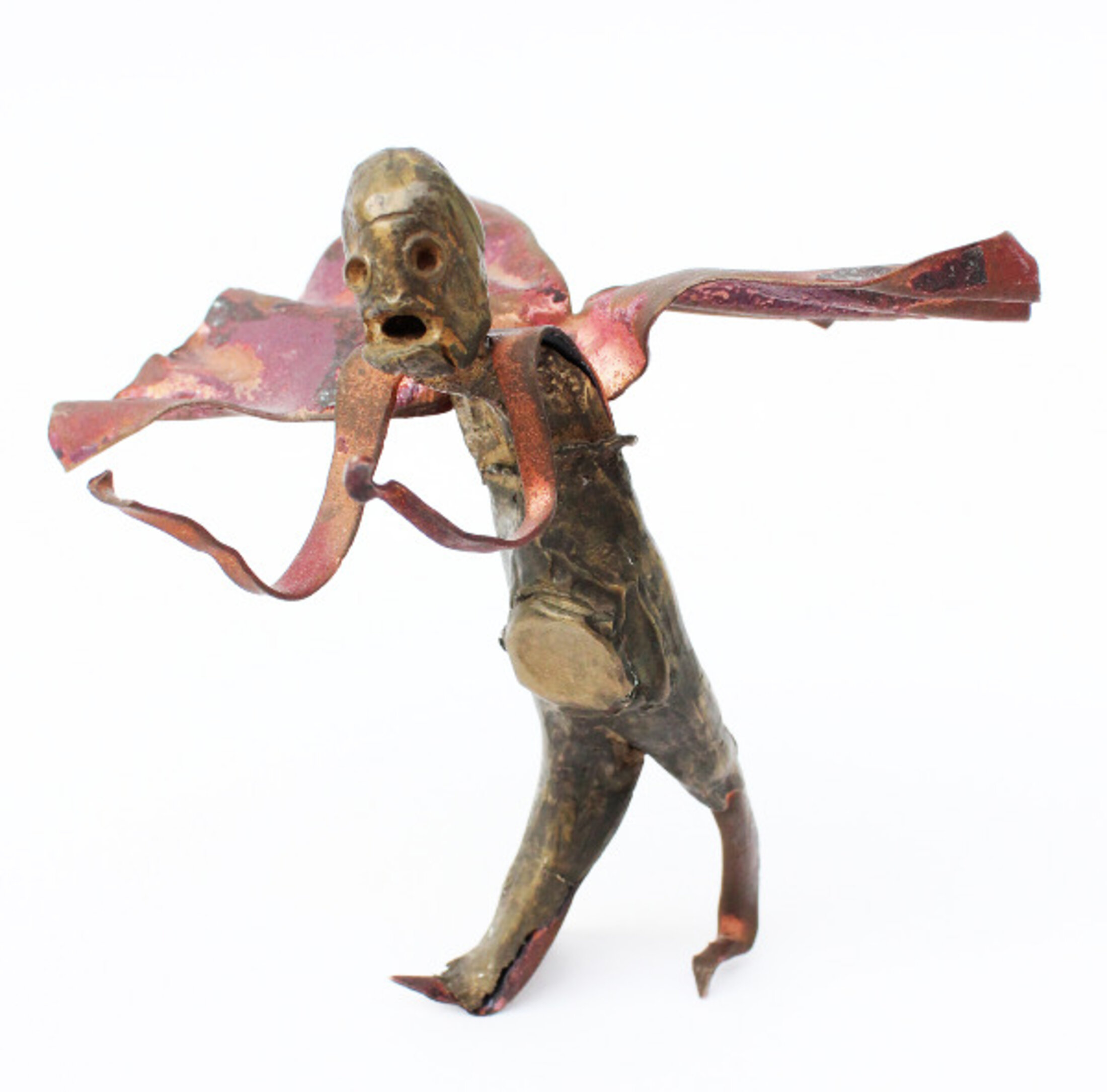 C'est sur ce mode de la connivence, de la sympathie, d'une affinité privilégiée que se crée le rapport aux choses et entre nous. Et cette affinité merveilleuse est toute matérielle. Car la matière participe de ce contact et de cette proximité : la chaleur du cuivre, la chaleur douce, rassurante du cuivre. Puis la rencontre du cuivre et du verre et du bronze et du fil, et d'autres choses encore. Les couples prennent formes d'une chaussure, les anges et les pieuvres de douilles, en général de tous les déchets devenus méconnaissables. Et pour ces déchets, ces ordures, pour ces objets délaissés et que la fainéantise humaine laisse pourrir, Camilo Cardenas a une certaine sympathie : l'amour de la matière émane de ces sculptures, avec une aura chaleureuse qui fait le charme et la réussite de son savoir-faire.