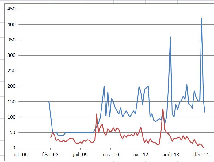 Médiapart, par la voie de son fondateur Edwy Plenel a donné quelques statistiques sur médiapart. Il y a actuellement à peu près 10000 blogs et 105000 abonnés. Sur les blogs, il faut savoir que les abonnés qui sont partis et revenus plusieurs fois sont comptés autant de fois que leurs blogs ont disparu et ont été recréés sous d’autres noms. Le graphique ci-dessous montre le nombre de créations de blogs(en bleu) mois par mois, ainsi que le nombre de départs(en rouge) mois par mois.