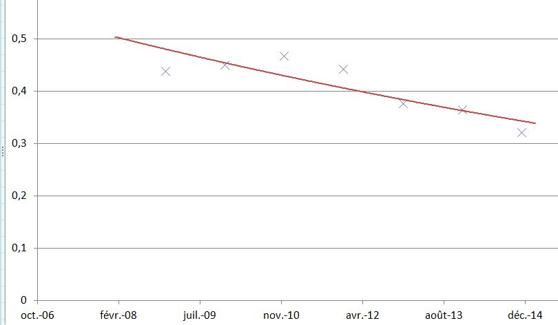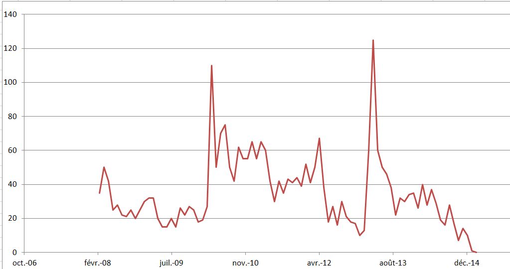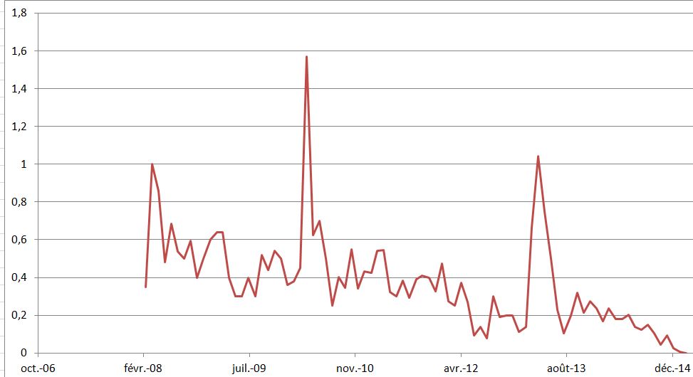 Les valeurs qui semblent aberrantes correspondent à des mois où le nombre de départs a été supérieurs au nombre de créations et correspond en général à des « crises internes » à Médiapart. En faisant une courbe de tendance, on note une diminution du nombre de départs, qui était assez élevée au début de la création jusqu’en 2012 et qui baisse vers 30%. Sur le dernier semestre de 2014, on est à moins de 20% de départs des blogs, ce pourcentage augmente naturellement avec le temps.