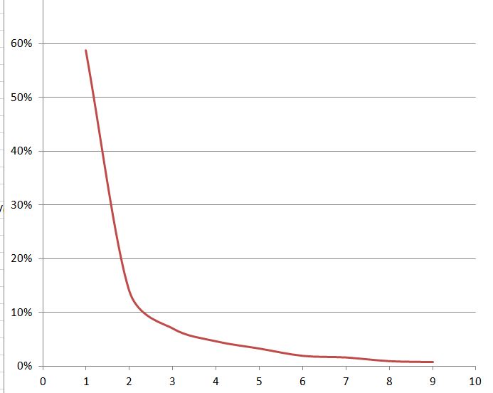 En ce qui concerne le nombre d’articles et le nombre de commentaires moyens, il est actuellement à 3,3 articles par blog et de 58 commentaires par blog. Ces moyennes cachent des disparités importantes, puisque 6% des blogueurs ont plus de 10 articles et 0,25 % des blogueurs ont plus de 100 articles. On voit dans le graphique ci-dessous, que 59% des blogs ont 1 seul article.