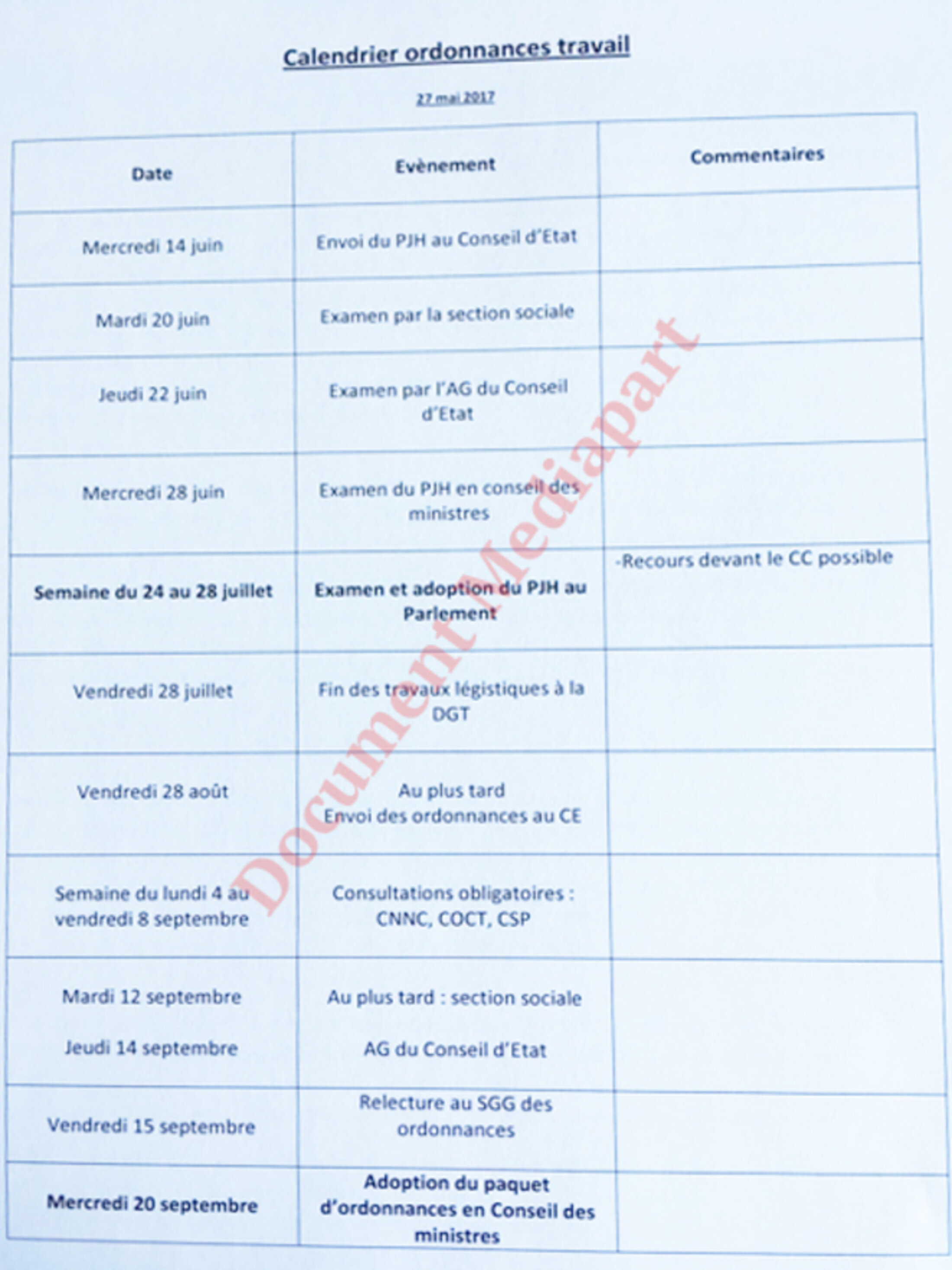 Plusieurs articles de presse ont dans un premier temps fait « fuiter » des extraits présumés du projet sur lequel planche le Gouvernement Macron-Philippe, tel le journal Le Parisien, qui a publié le 5 juin 2017 neuf projets d’ordonnances, antérieurs aux rencontres organisées par l’exécutif avec les partenaires sociaux.