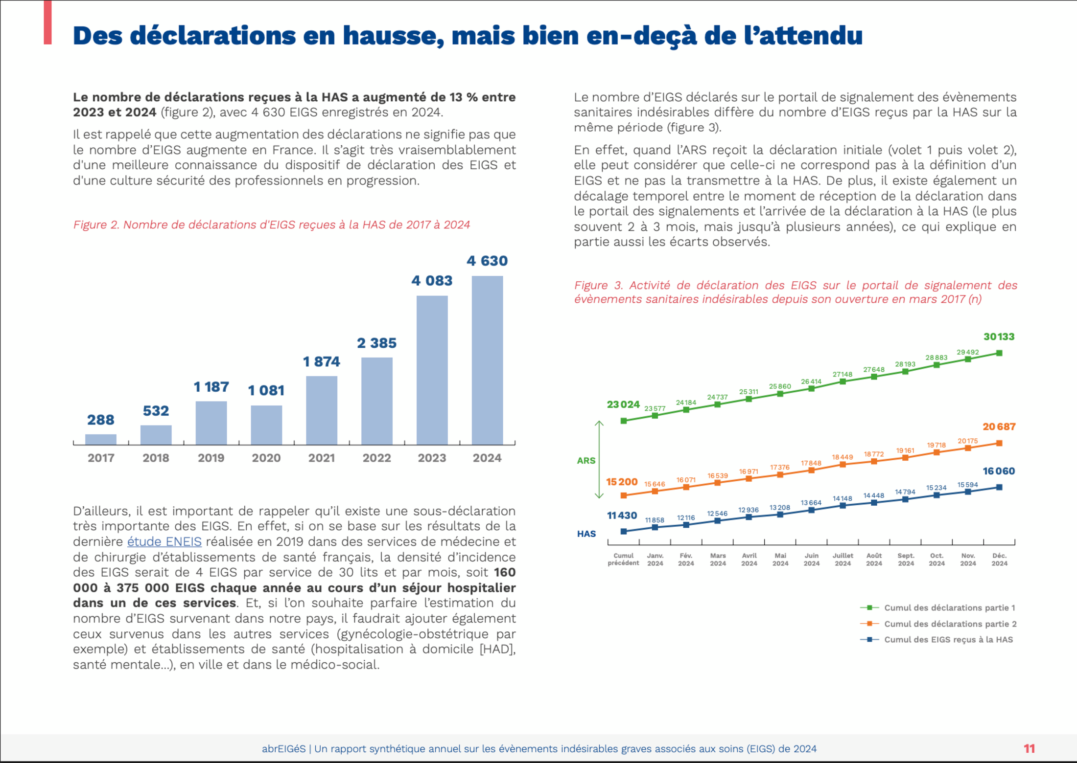 Précisons que c’est sur la base des incidents effectivement déclarés que le Ministère de la Santé et la Haute Autorité de Santé (HAS) établissement des jolies statistiques dont on admirera la mise en page à défaut de pouvoir se fier aux données qu'elles contiennent (par exemple ici) ! En faisant un peu moins de mauvais esprit, on se satisfera de la fiabilité de ces documents au moins lorsqu’ils affirment que les données qu’ils rapportent ne sont pas fiables…