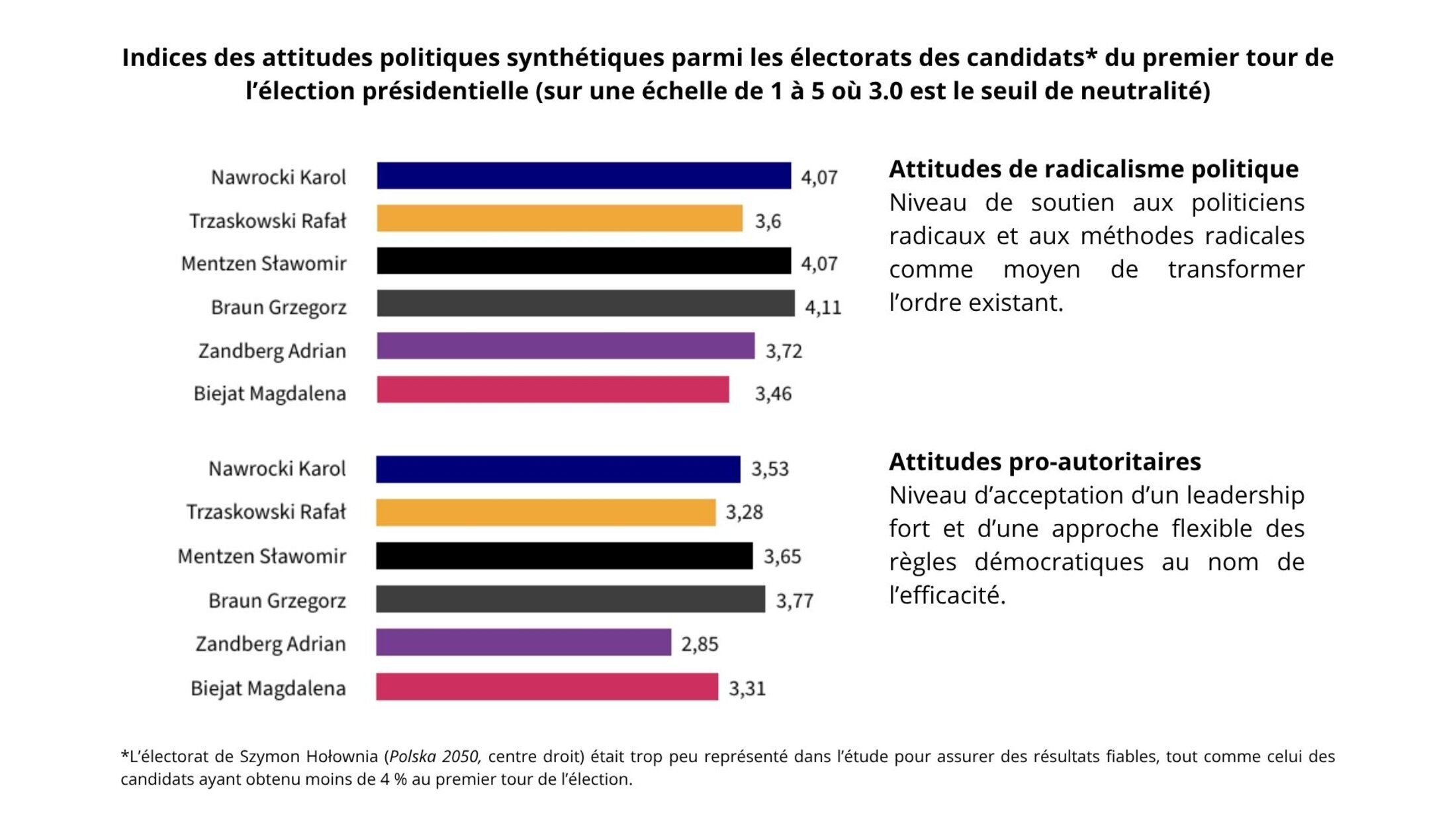 En ce qui concerne l’acceptation des attitudes autoritaires en politique, elle progresse dans tous les électorats. Même les partisans du libéral Trzaskowski affichent un score au-dessus du seuil de neutralité sur l’échelle du soutien à un « leader fort, capable de contourner les règles ». Mais, c’est au sein des électorats de l’ensemble des candidats de droite, y compris celui du président élu Karol Nawrocki, que l’impatience envers