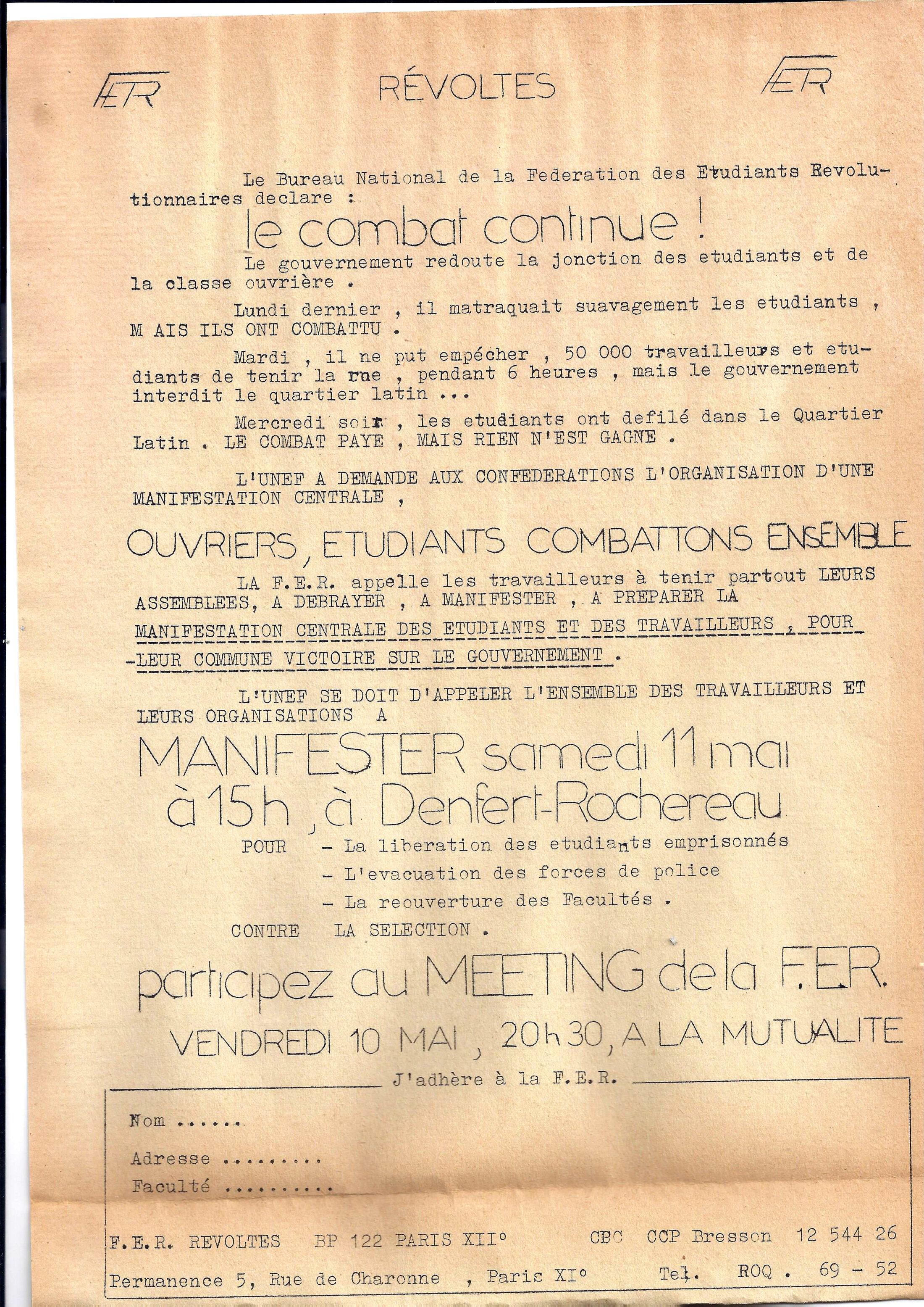 Appel de la F.E.R. au meeting vendredi 10 mai © F.E.R., Fédération des étudiants révolutionnaires.