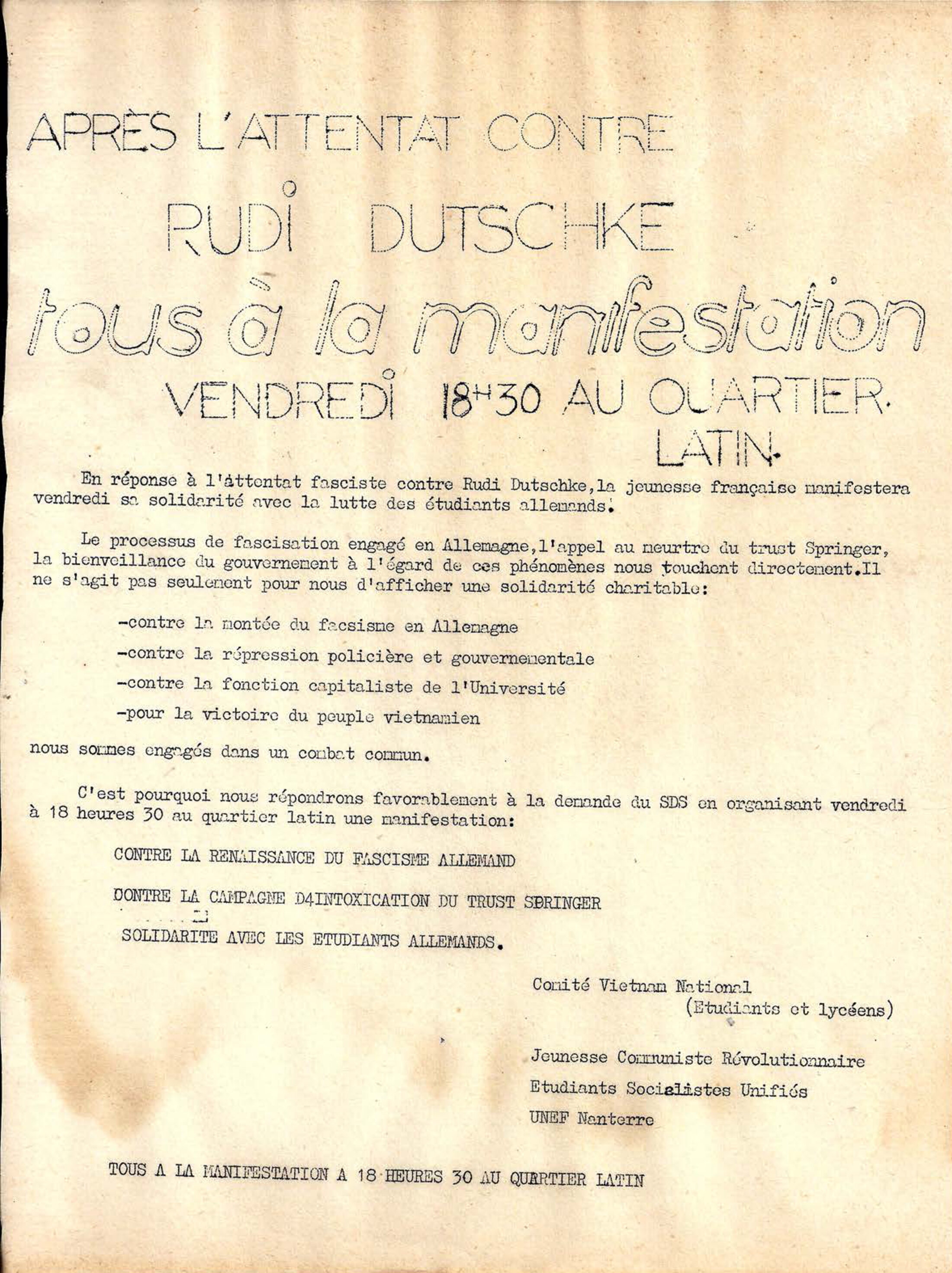Après l'attentat du 11 avril contre "Rudi le Rouge" (Rudi Dutschke), leader de la Ligue des étudiants socialistes allemands, la jeunesse française manifeste en solidarité avec les étudiants allemands.
