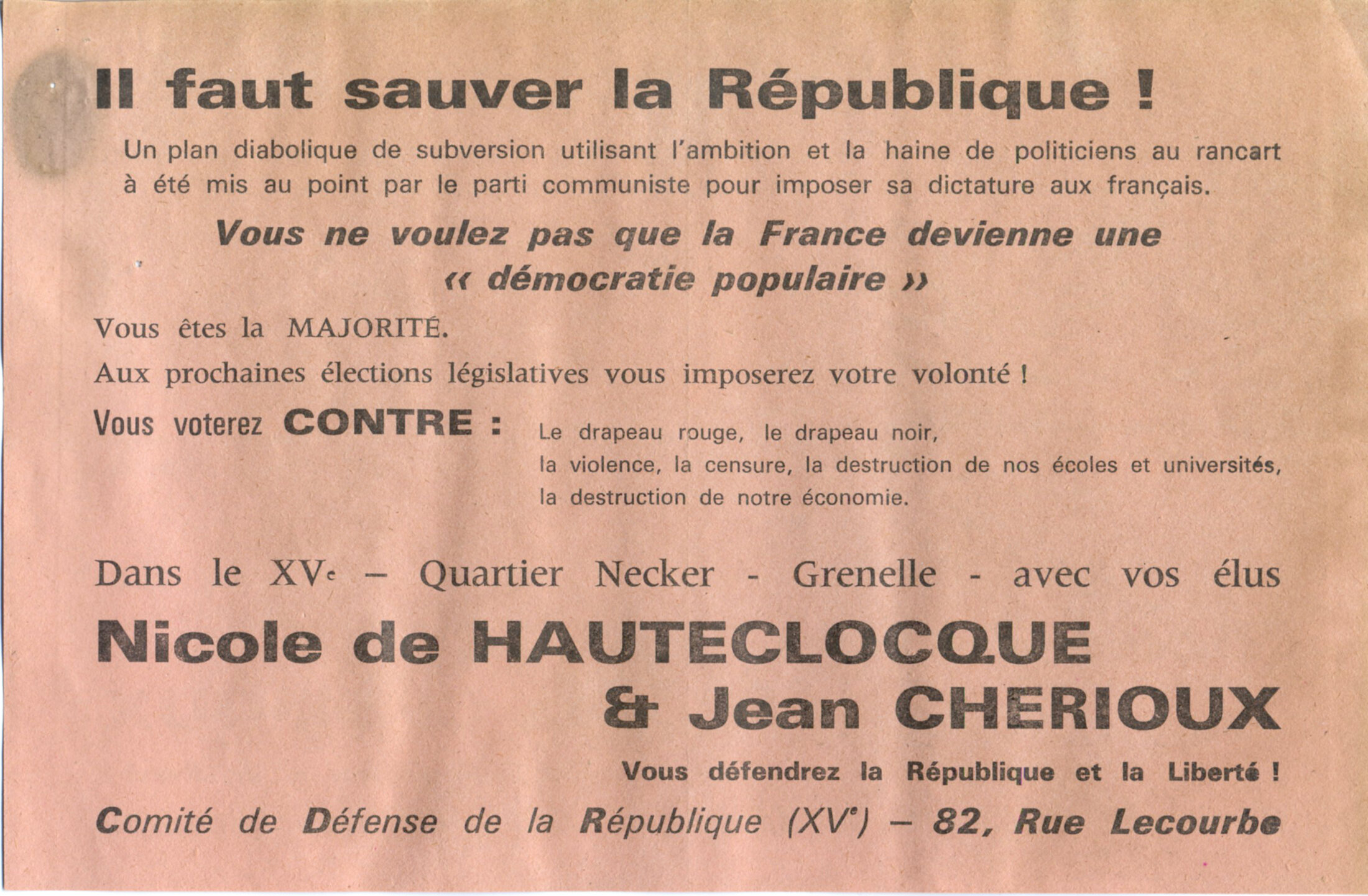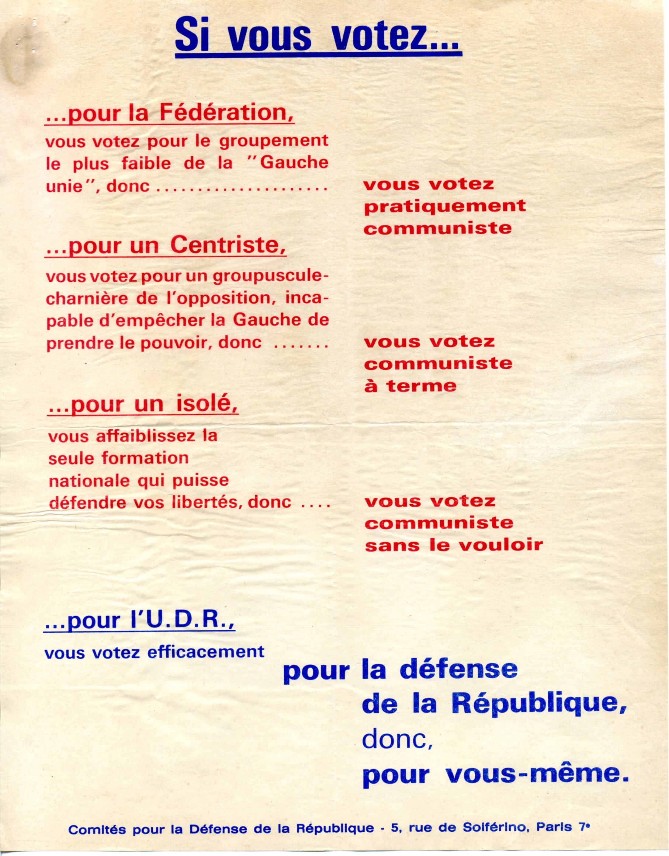 Tract pour appel au vote pour l'U.D.R. en opposition au parti communiste © Comité de défense de la République