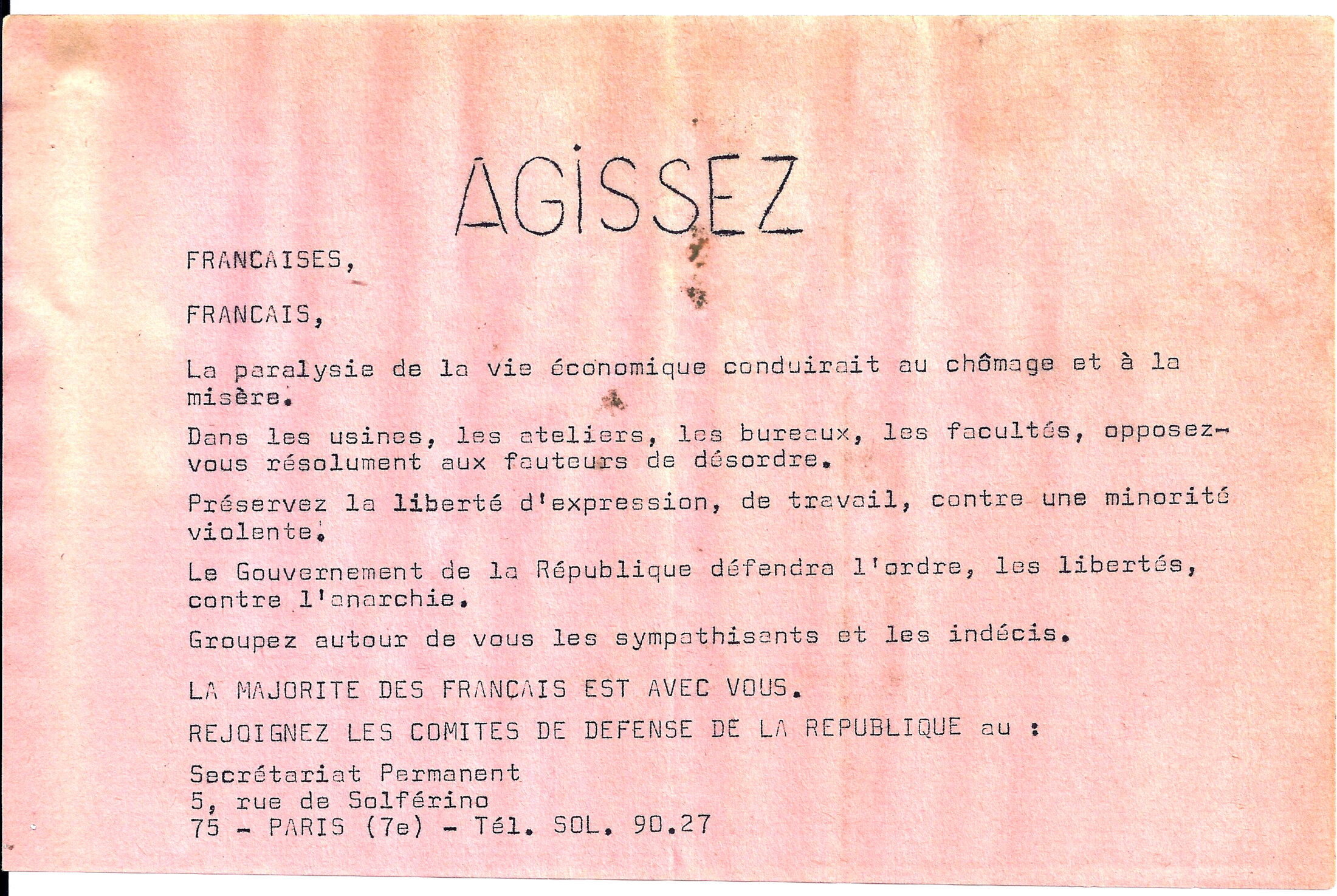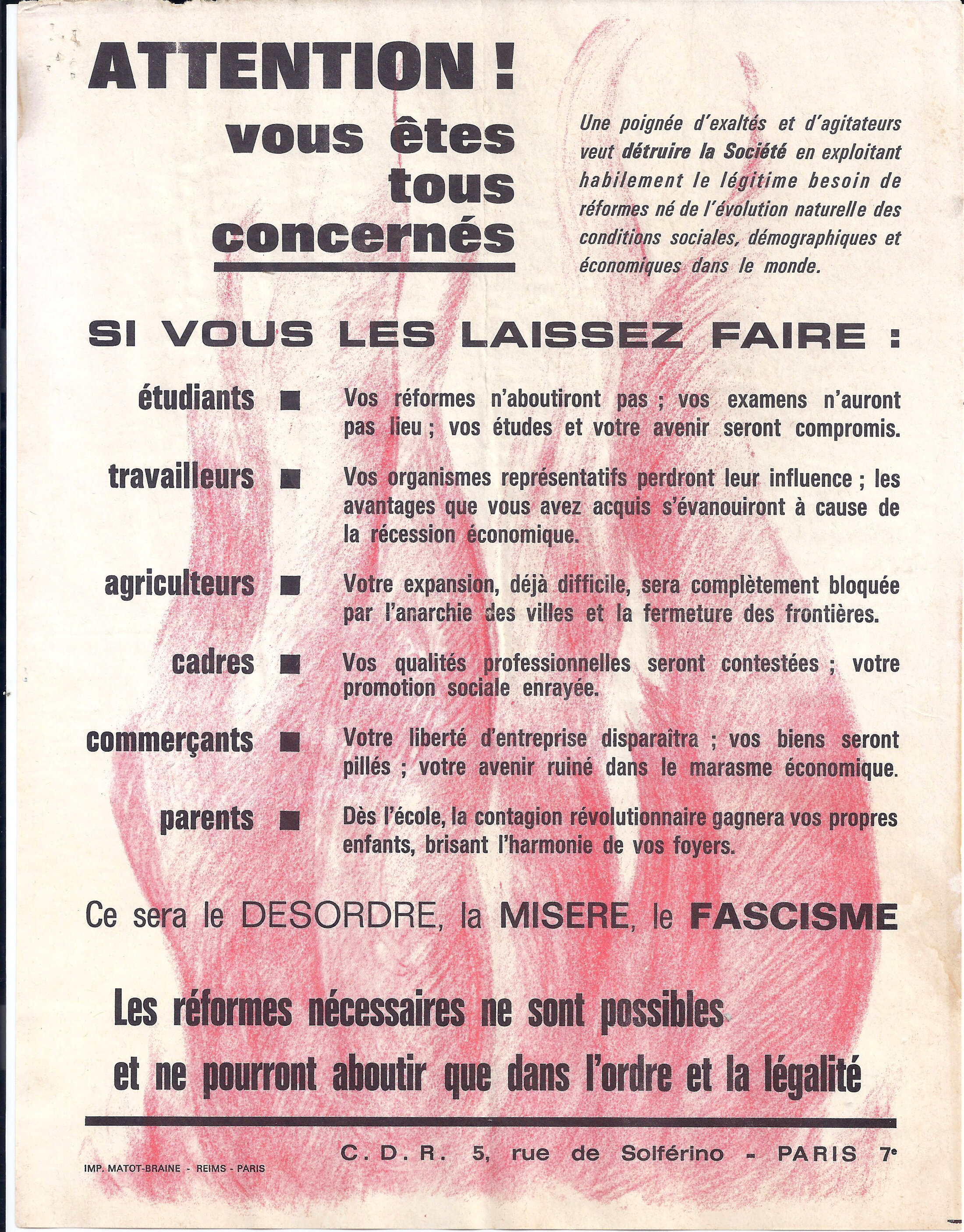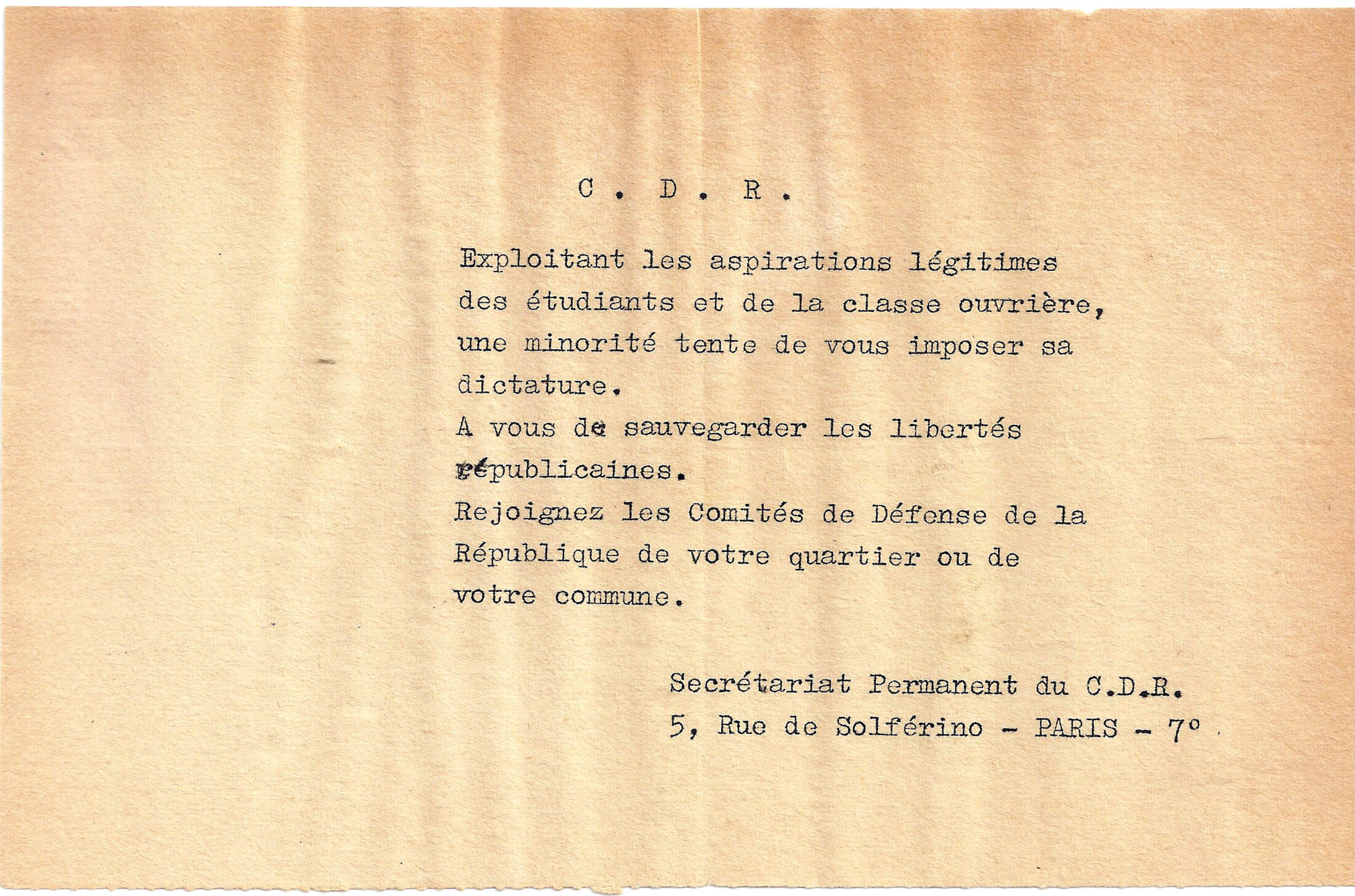 A partir du 19 mai surgissent les tracts des CDR. C’est le jour où, rentrant de Roumanie, le général de Gaulle déclare : "La réforme oui, la chienlit non". Quand le Festival de Cannes est interrompu, l’Opéra est occupé, Jean-Paul Sartre parle à la Sorbonne et les grèves s’étendent, les CDR alertent des risques de désordre, de misère et de fascisme puis appellent à voter contre le parti communiste.