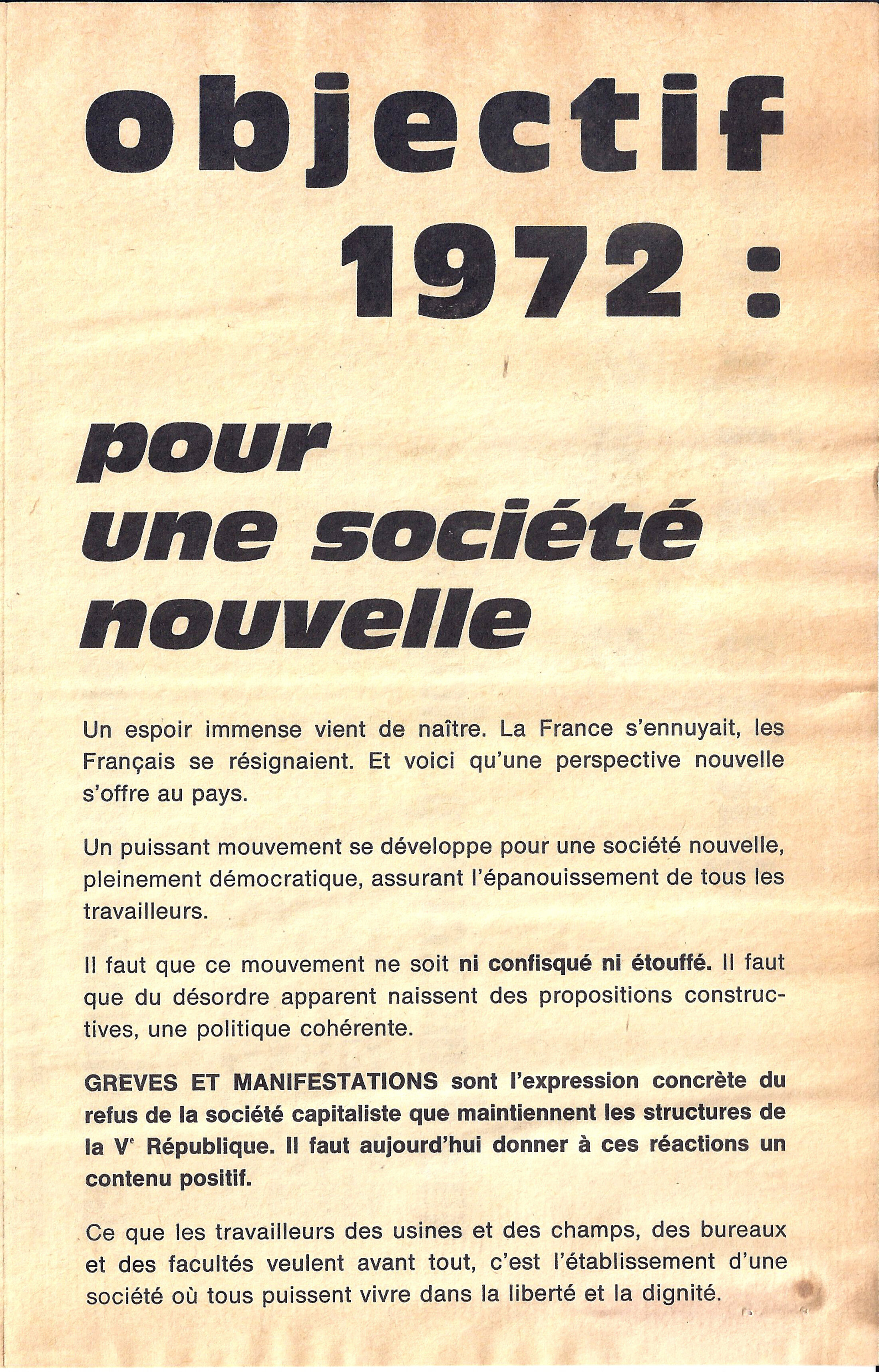 Ses membres sont libres de s'engager dans les formations existantes. Le mouvement précise dans une de ses publications sa vocation : Ayant refusé de s’engager dans les batailles électorales en 1967 et en 1968, Objectif 72 n’est donc pas un parti au sens traditionnel du mot. Il ne se contente pas non plus de mener à bien des études exploitées par d’autres et, implanté sur tout le territoire, voire au-delà, il associe les usagers à chacun de ses projets. Il ne peut être assimilé à la catégorie intellectuelle des clubs. En fait, soucieux d’explorer les voies de l’action politique telle qu’elle sera comprise dans les décennies à venir, Objectif 72 s’efforce de provoquer l’apparition d’une espèce nouvelle d’animateurs politiques, insérés personnellement et collectivement dans la vie de la cité. ( https://fr.wikipedia.org/wiki/Objectif_socialiste )