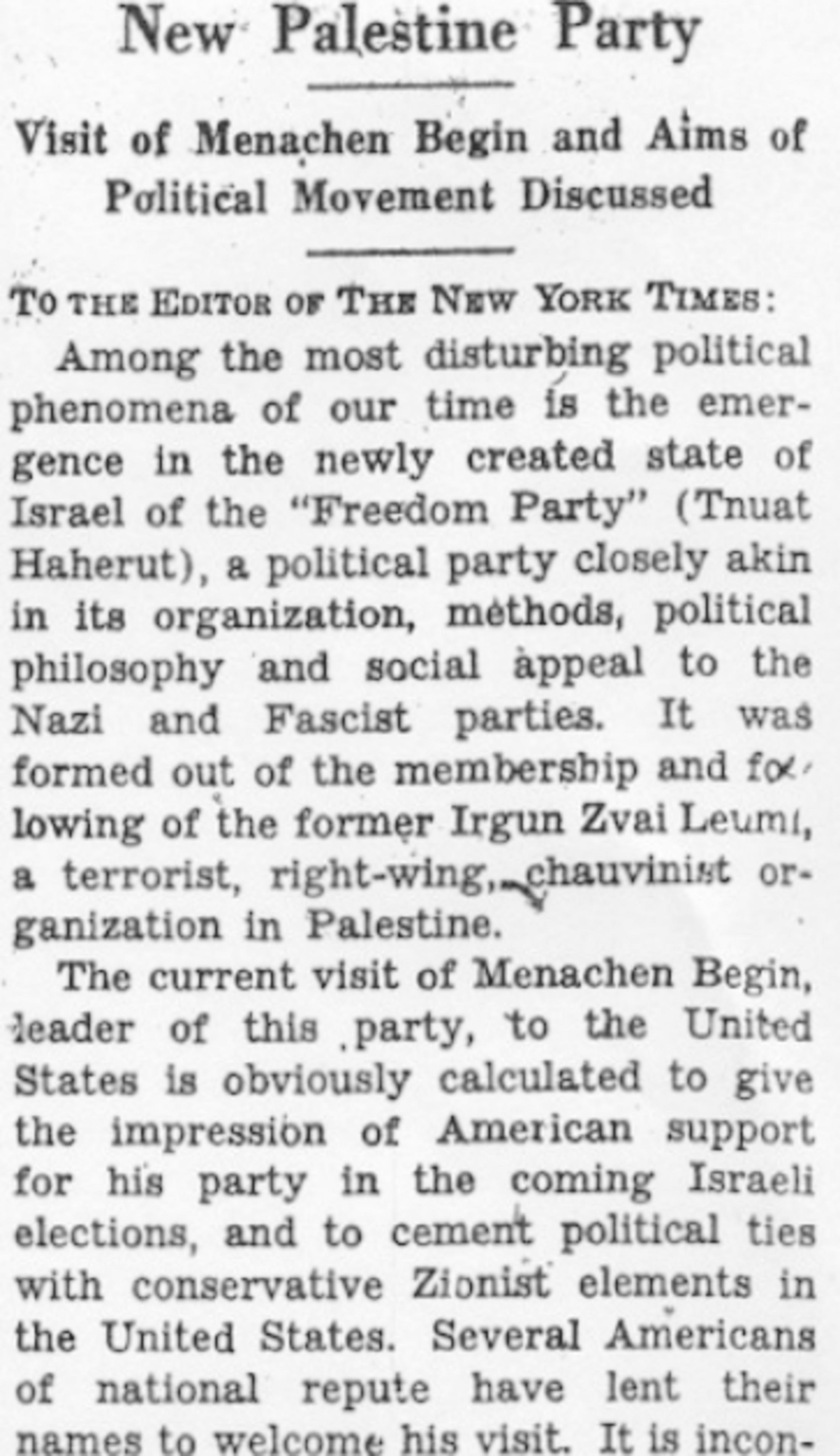 « Par son organisation, ses méthodes, sa philosophie politique et son discours social le « Herout » (Parti politique ancêtre du Likoud, le Parti de Benyamin Netanyahou) ressemble aux partis nazis et fascistes [The "Freedom Party" (Tnuat Haherut), a political party closely akin in its organization, methods, political philosophy and social appeal to the Nazi and Fascist parties] ».