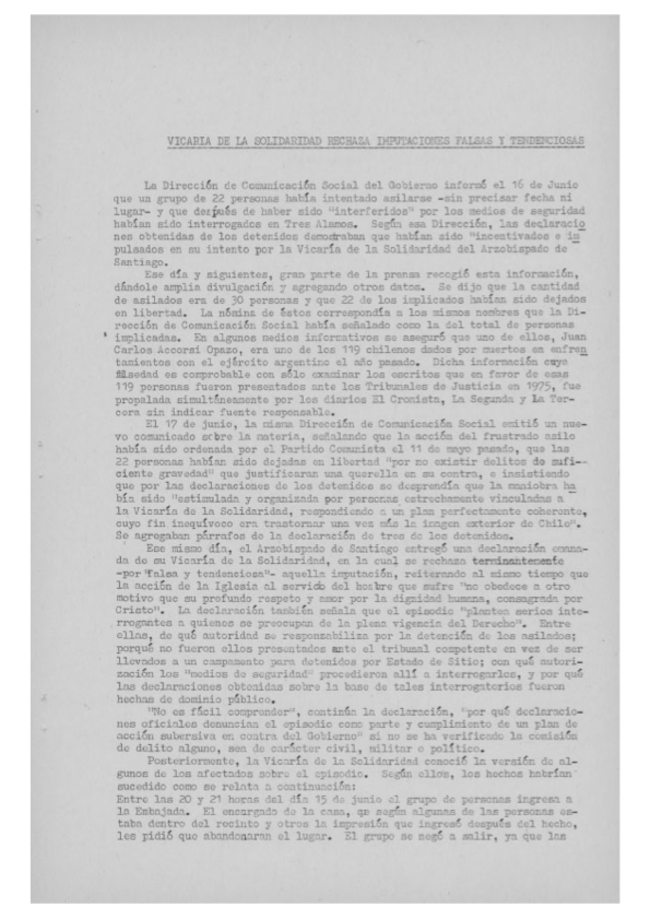 Il y a quarante-sept ans, le 16 juin 1976, deux religieuses européennes, Odile Loubet (française) et Clarita Walshe (irlandaise) coordonnent la mise à l’abri d’un groupe de vingt-deux personnes menacées par le régime dans l’ambassade de Bulgarie. Celle-ci est alors gérée par l’ambassade d’Autriche suite au retrait des pays du Bloc de l’Est du pays depuis septembre 1973, une mesure de rétorsion diplomatique et de condamnation du golpe. Les deux femmes se déguisent en bourgeoises aux perruques rousses pour accompagner le groupe jusqu’à l’enceinte diplomatique située dans les quartiers huppés de la capitale et leur faire franchir les murs. Mais ce passage en force ne fonctionne pas : les diplomates refusent de coopérer et de lancer la procédure d’asile pour les réfugiés. En l’espace de quelques heures, les services secrets du régime – la tristement célèbre DINA – sont alertés et perquisitionnent l’ambassade. Tout le groupe est arrêté.