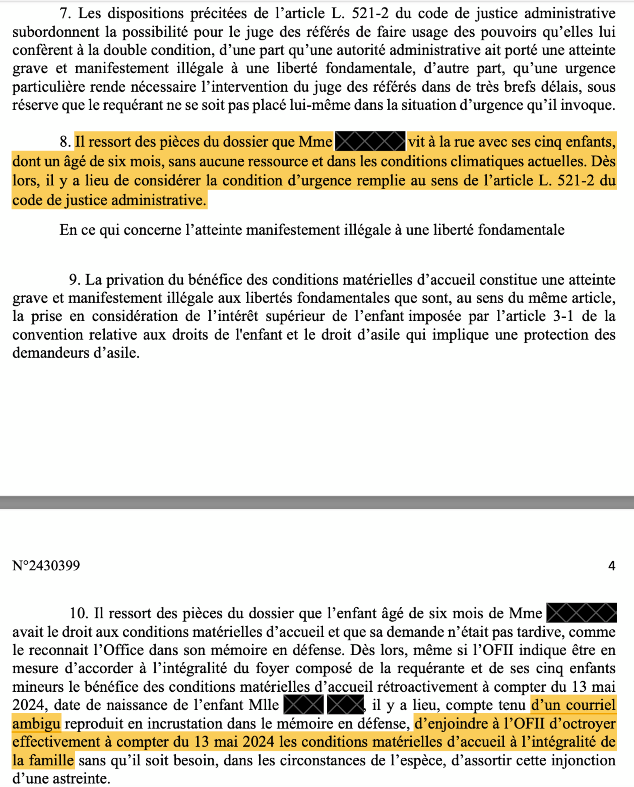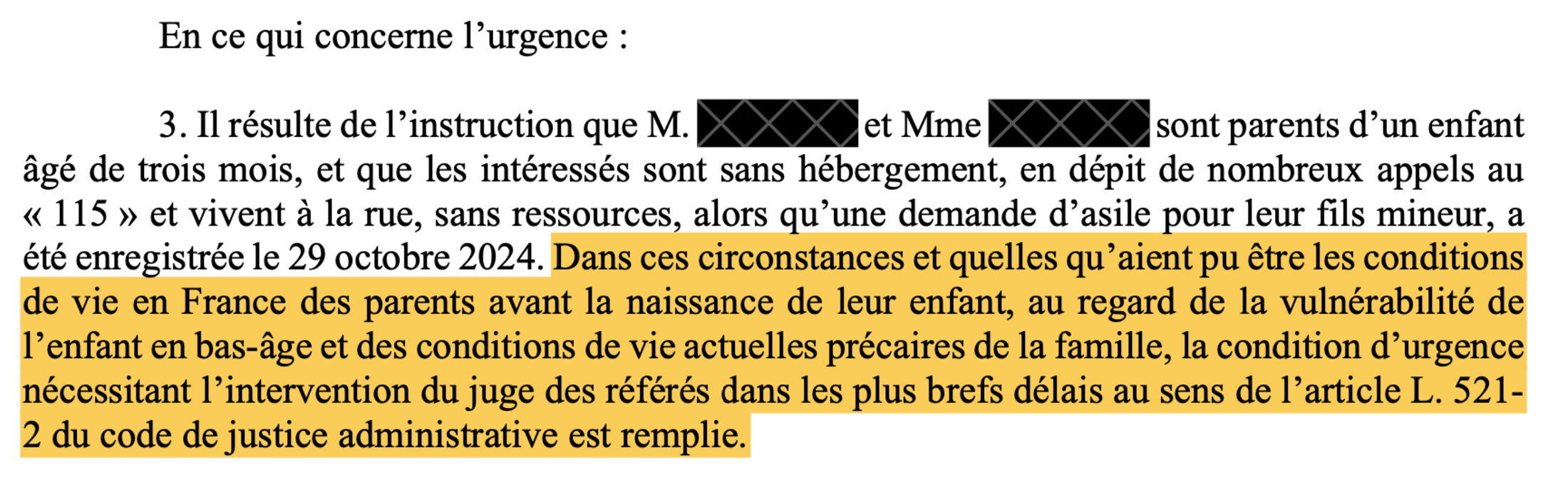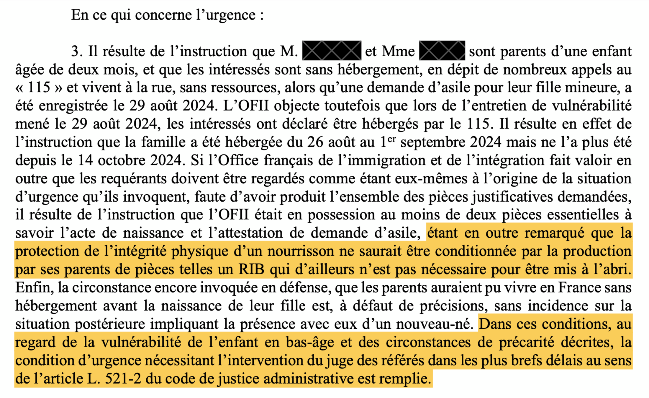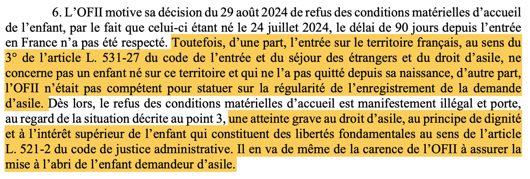 Un couple avec leur fils de 3 mois en demande d’asile dans la rue. Dans son mémoire en défense, l'OFII indiquait notamment que la famille n'avait pas « déclaré de problèmes de santé ». Pour l'OFII donc, il n'y a aucune difficulté à laisser un nourrisson de 3 mois dans la rue. L'OFII avait refusé le 29 octobre 2024 les conditions matérielles d’accueil au motif que leur fils avait déposé sa demande d’asile plus de 90 jours après son entrée en France. Or, il est né en France, de sorte que le délai de 90 jours n’est pas opposable à l’enfant qui est né en France.