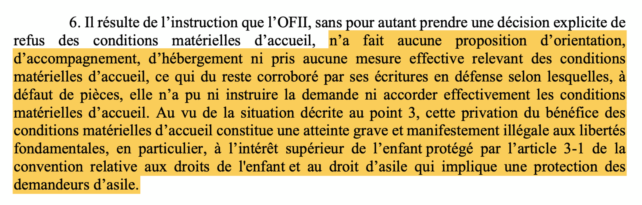 L'OFII indiquait dans son mémoire en défense que la famille ne démontrait "aucune vulnérabilité médicale" ni aucune aggravation ou dégradation de leur situation de la famille sur le territoire français. Pour l'OFII donc, il n'y a aucune difficulté à laisser un nourrisson de 2 mois dans la rue. Il indiquait également que des documents avaient été demandés à la famille. Or, ces documents, l’OFII les récupère dès l’entretien de vulnérabilité et l'OFII les produit devant le juge.