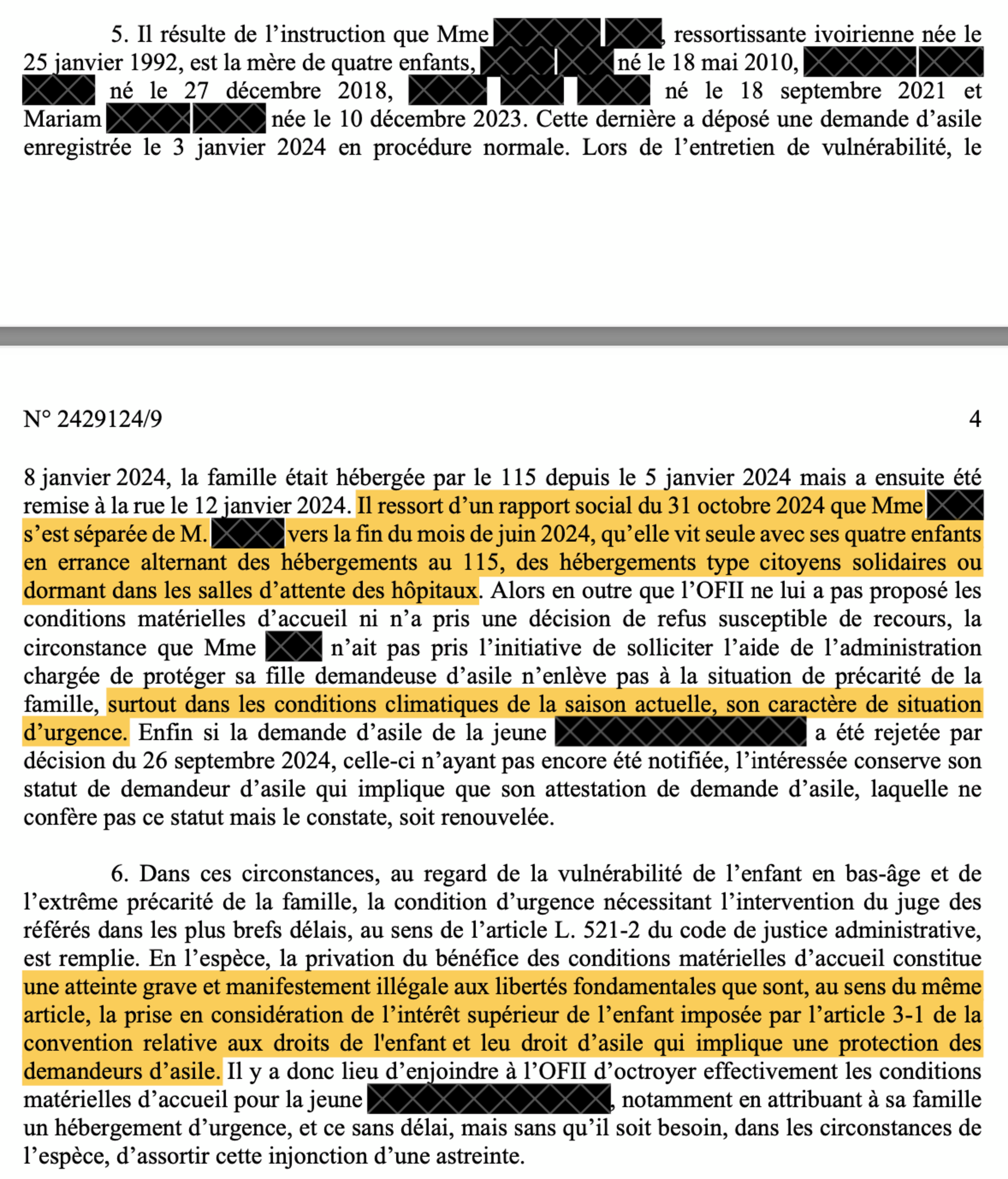 Une maman seule avec ses 4 enfants âgés de 10 mois, 3, 5 et 14 en demande d'asile depuis le 3 janvier 2024. Dans son mémoire en défense, l'OFII indiquait que « lors de l’entretien de vulnérabilité, elle n’a fait part d’aucun problème de santé ou encore de besoin d’adaptation particulier » et que « la requérante, ainsi que les membres de sa famille, ne se trouvent nullement dépourvus d’un hébergement et ne présentent aucun problème de santé ». Pour l'OFII donc, il n'y a aucune difficulté à laisser 4 enfants de 10 mois, 3, 5 et 14 ans dans la rue et à mentir en indiquant qu'ils ne sont pas dans la rue malgré la multitude d'appels au 115.