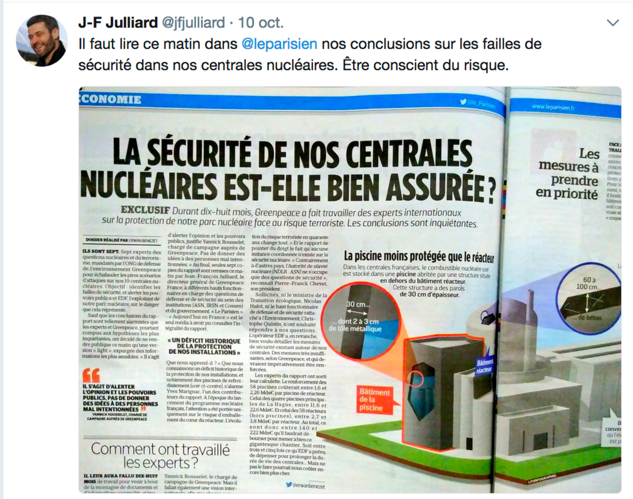 Des activistes sont entrés dans la centrale nucléaire de Cattenom en Moselle, sans armes, ni violence, pour démontrer la vulnérabilité de nos centrales . Le spectaculaire pour dévoiler les risques que nous encourons. Quelques jours auparavant Greenpeace publiait un rapport sur les failles de nos centrales. Une version light est envoyée aux journaux. La responsabilité est complexe : alerter l'opinion et les pouvoirs publics pour réclamer la sécurité, mais sans donner de détails pour des personnes mal intentionnées. Sept experts de nationalités différentes ont enquêté. 18 mois à « imaginer le pire pour éviter qu'il ne survienne ». Le rapport complet alarmant a été remis à quelques hauts fonctionnaires en charge des questions de défense et sécurité.