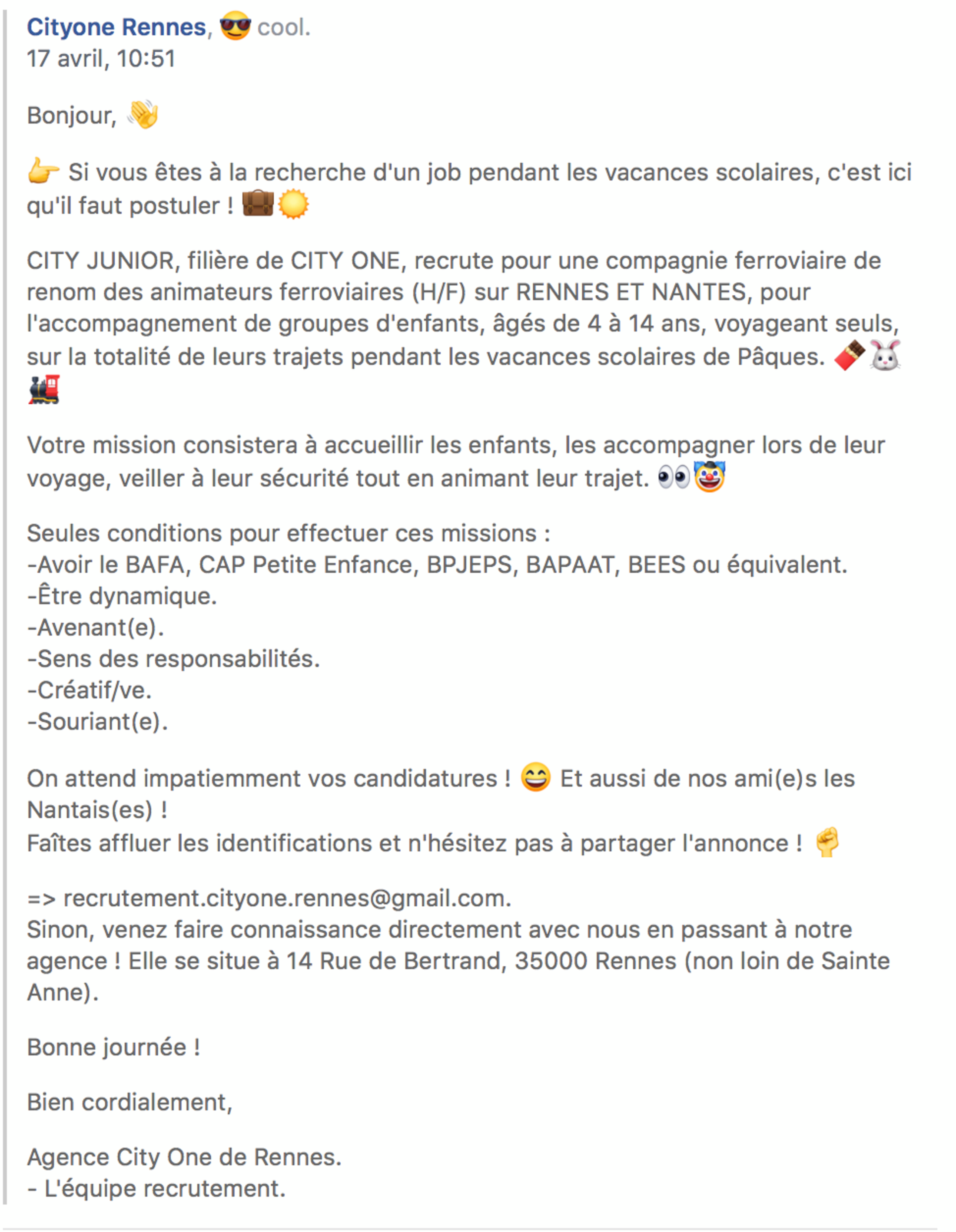Voici l'annonce de City One, l'entreprise sous-traitée par la SNCF pour accompagner les enfants seuls dans les trains :