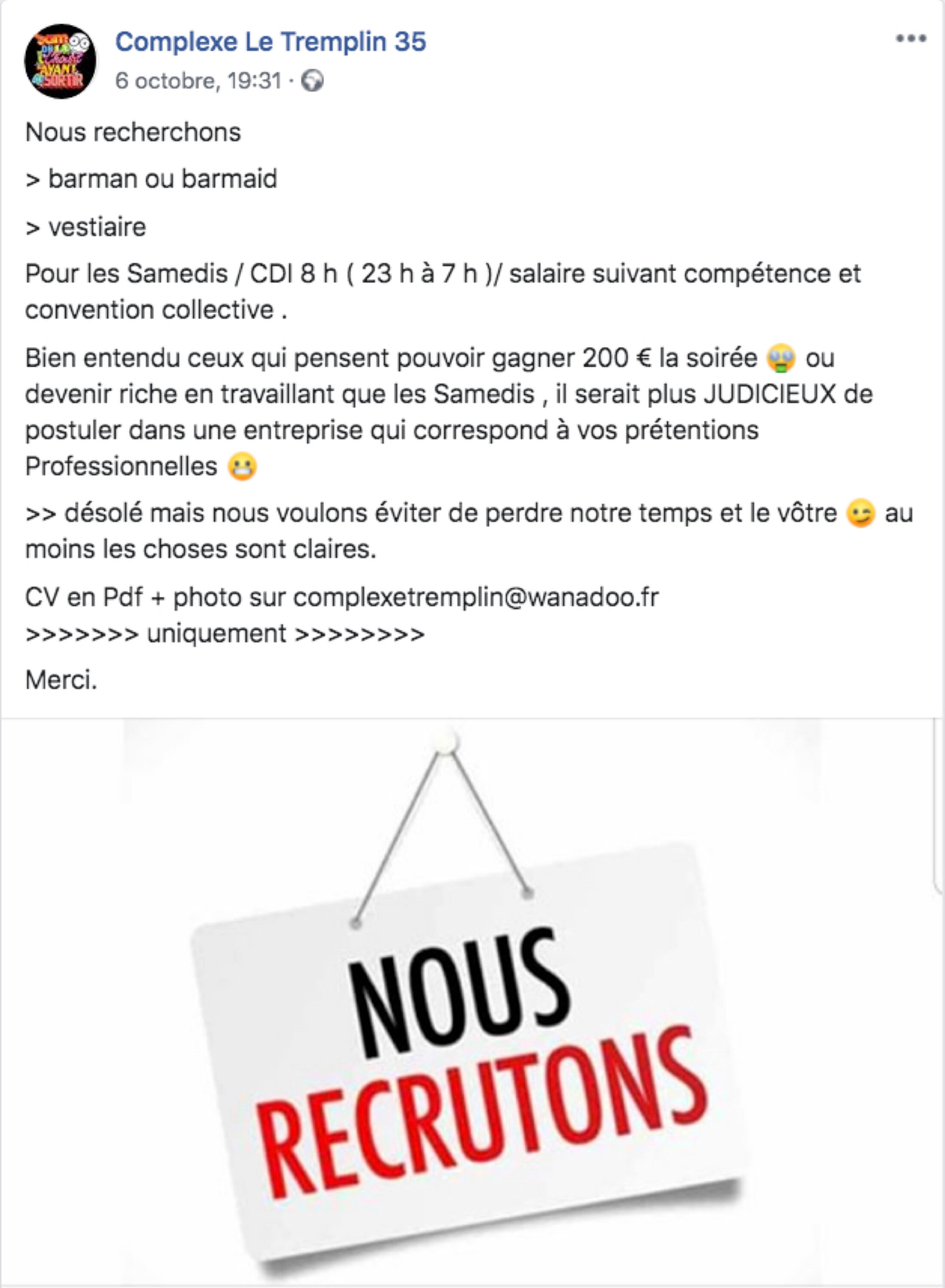 En revanche, vous ne précisez pas vraiment s'il s'agit du même poste ou de deux postes séparés (vestiaire et barmaid). Votre annonce est un peu floue sur la question, et elle n'est d'ailleurs pas très claire dans l'ensemble, si vous me permettez la critique. Il est tard et je suis fatiguée, et c'est plutôt agaçant de devoir plisser les yeux pour relire des phrases mal écrites ou pas assez développées alors que notre avenir est quand même en jeu, du moins nos samedis (cf. les gilets jaunes). Si vous m'embauchez également comme Community Manager, je pourrai faire des annonces très jolies et bien mises en page, bien au-delà du Clipart de word, avec des textes percutants et clairs qui pourront être compris à n'importe quelle heure de la nuit. A l'exception bien sûr d'offres d'emploi qui remplaceraient mon poste, je ne suis pas idiote.