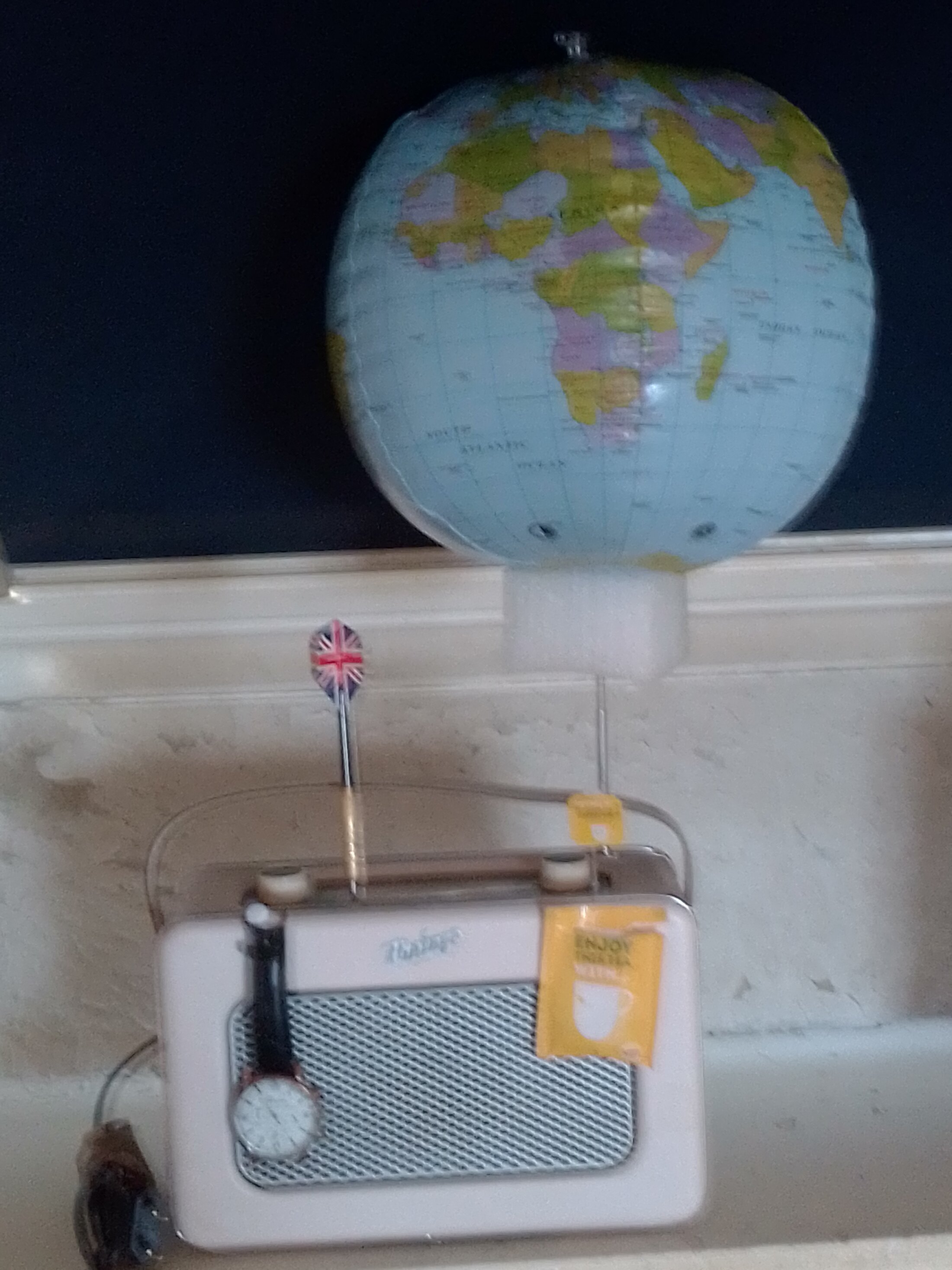 La radio AKAI vintage (« rouge » en japonais) fonctionne parfaitement, sur piles ou sur secteur, avec le bouton marche / arrêt placé à l'arrière. L'heure est donnée par une montre Geneva, dont le bracelet et le verre sont cassés, mais qui fonctionne toujours, en émettant un tic-tac régulier. Le sachet de thé, tiré d'une édition limitée collector de Lipton, est à partager, chaque matin, avec la personne de votre choix. À moins que vous ne préfériez le prendre seul, lors d'une insomnie, en écoutant « les Nuits de France Culture », pour tenter de vous rendormir, voire la BBC, pour vous cultiver. Le globe terrestre, de 30 cm de diamètre, est un ballon gonflable. Dans la prise auxiliaire, est plantée une fléchette, qui vous donne le pouvoir de détruire le monde – ce qu'il vaut mieux éviter, pour ne pas dénaturer l'oeuvre.