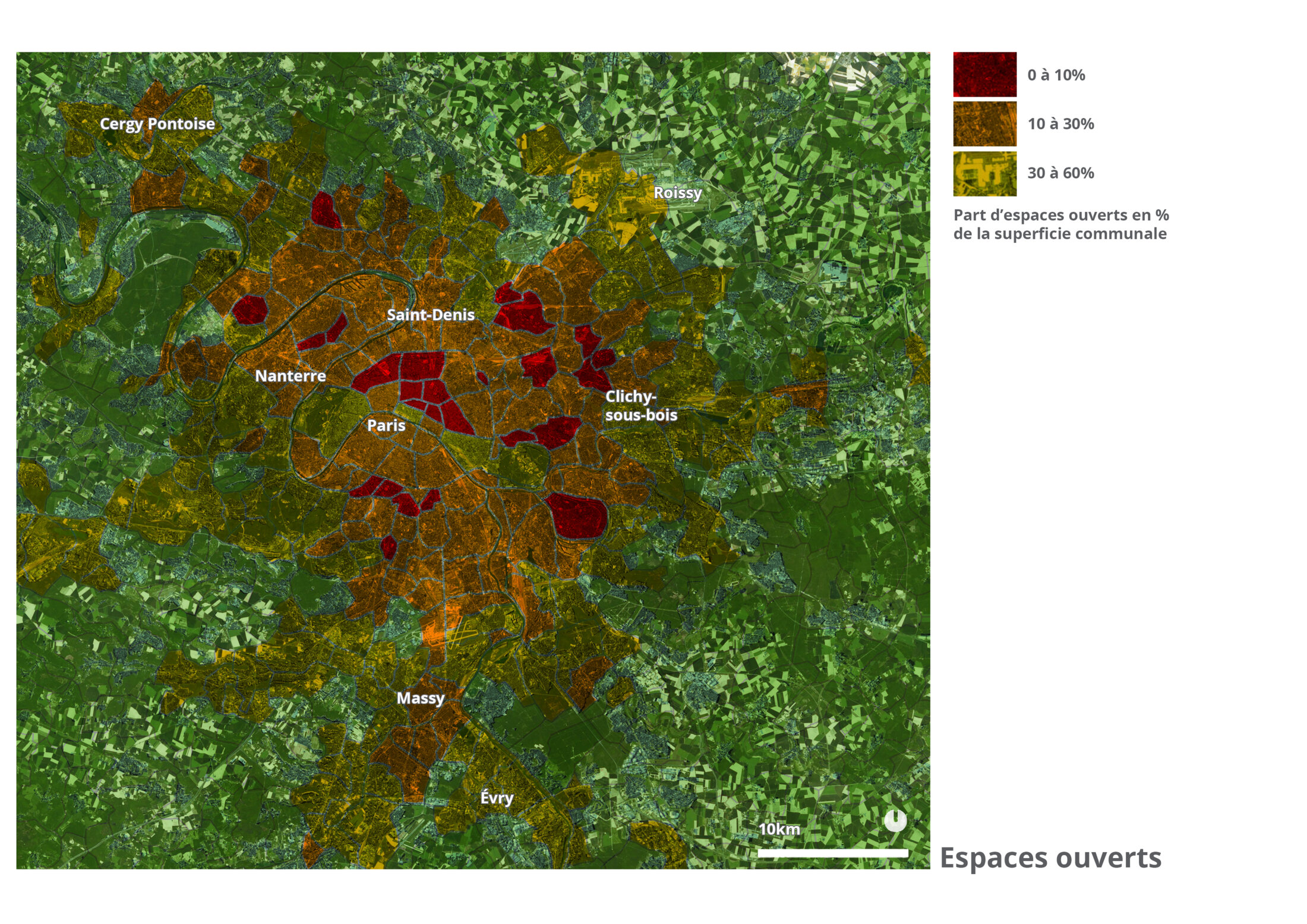 La carte des espaces ouverts montre les villes et les quartiers les plus denses de l’agglomération. La plupart des communes du Grand Paris disposent de moins de 30% d’espaces ouverts. Paris est une des capitales les plus denses d’Europe avec 5,8m² d’espaces verts par habitant, Aubervilliers ne dispose que de 1,42m² par habitant... L’OMS préconise au moins 12m² d’espaces verts publics par habitant.