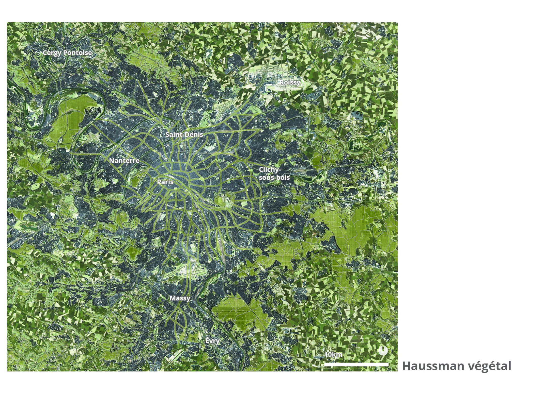 En partant des forêts franciliennes, des arbres remarquables, des espaces protégés, l’étalement favoriserait les continuités écologiques existantes en les préservant et les valorisant et en développant des continuités potentielles permettant à la faune et à la flore de coloniser ou reconquérir le territoire. La continuité entre les espaces végétalisés, au niveau du sol et de la canopée crée un corridor, un réseau permettant à la faune locale d’accroître son territoire et rendant plus perméable la frontière entre la ville et les sites naturels périphériques. Ces corridors peuvent être des bosquets, des haies bocagères, des bandes herbacées, des jardins particuliers, des toitures plantées, des mares, des fossés ou encore des passages artificiels pour franchir des axes routiers. Ils pourraient prendre la place des axes routiers eux-mêmes, à l’instar des voies sur berge. La suppression du périphérique par exemple permettrait de récupérer 240 hectares de terre sur 35km. Les boulevards végétaux pourraient aussi envahir les rues secondaires et les impasses, se développer dans les cours d’écoles et de crèches, relier les parcs, les jardins ouvriers, remplacer les places de stationnement, embellir les trottoirs, les retraits de façade.
