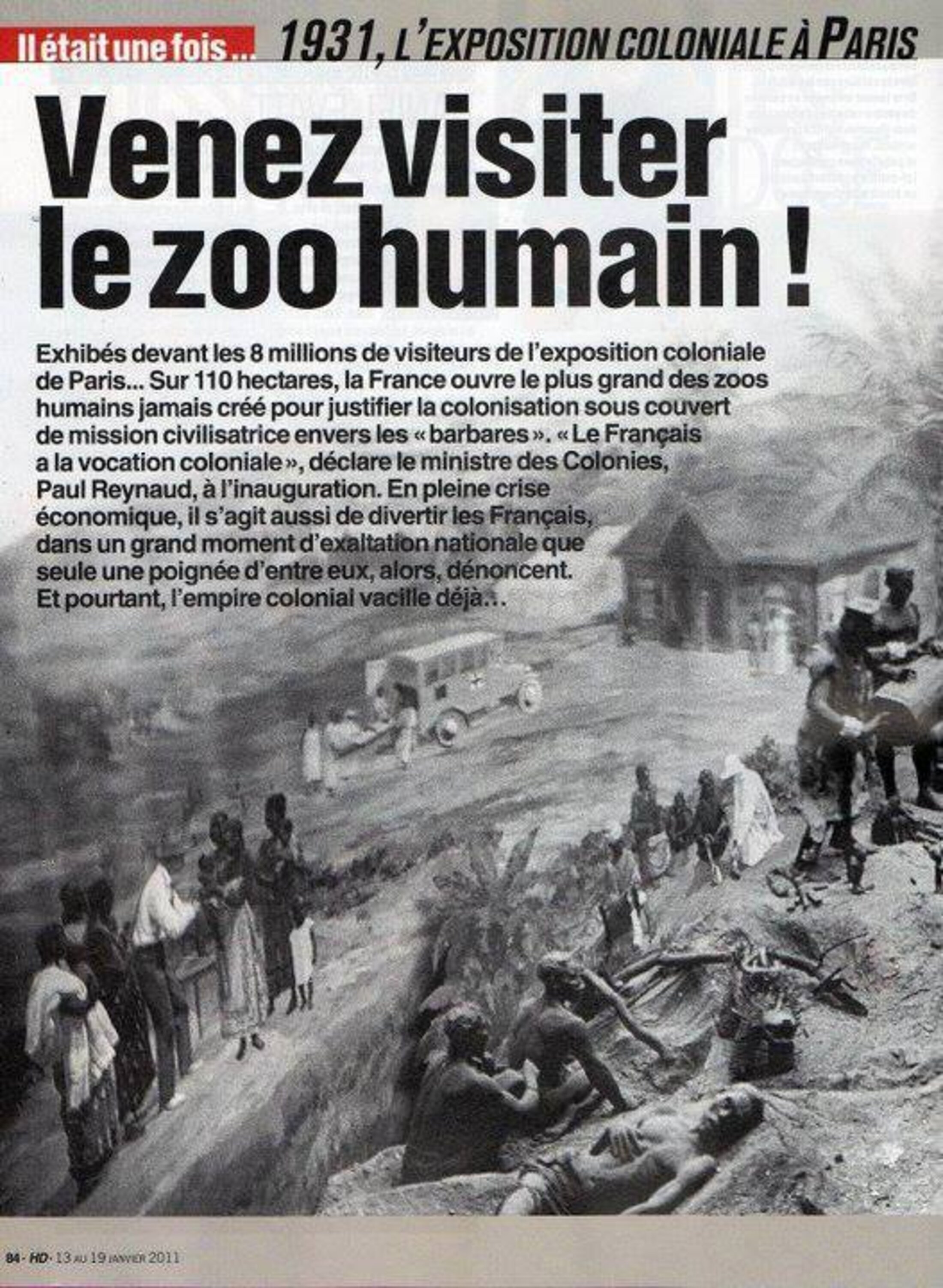 Durant la traite négrière et la colonisation, des milliers d’hommes, de femmes et d’enfants africains ont été acheminés vers l’Europe et l’Amérique pour être exhibés dans des zoos, des foires, des cirques et autres exhibitions. Comme le rappelle la Conférence sur les zoos humains de 2015, sur les grillages de ces zoos, on pouvait lire des inscriptions disant : « Défense de donner à manger aux indigènes, ils sont nourris ». Cela n’empêchait pas certains visiteurs de leurs lancer des bananes.