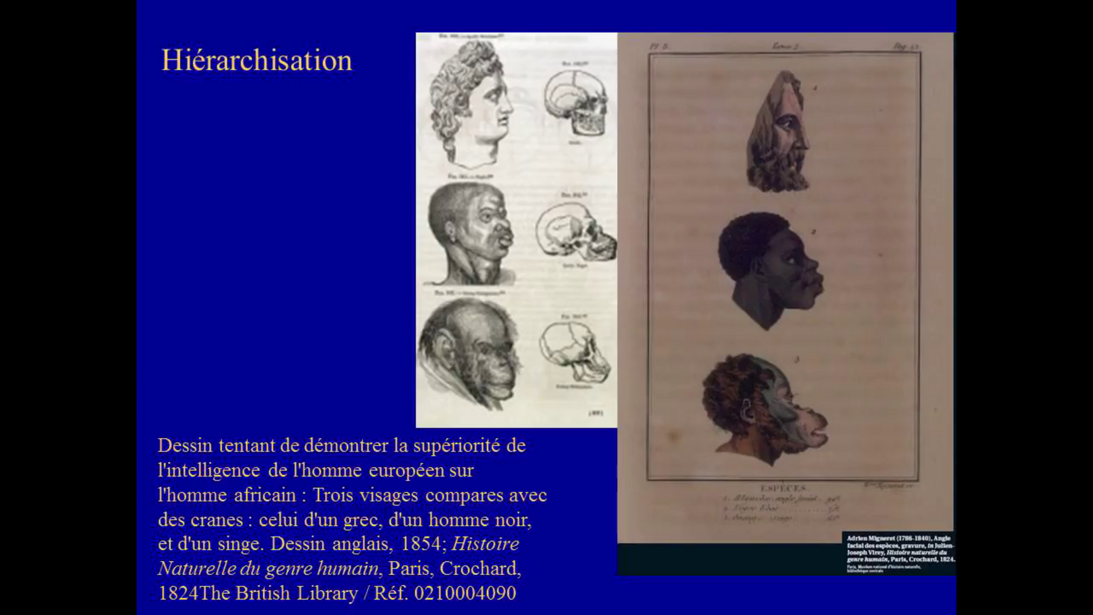 Quand les Européens instaurent la traite négrière, pour justifier cet acte innommable, ils théorisent le concept de supériorité des races. Ils réduisent donc l’homme noir à un être non civilisé, sauvage, un animal. On commence, dès lors, à trouver dans des ouvrages de vulgarisation scientifique (on dirait aujourd’hui « pseudo-scientifique »), des croquis relevant les points de comparaison entre un Noir et un singe.