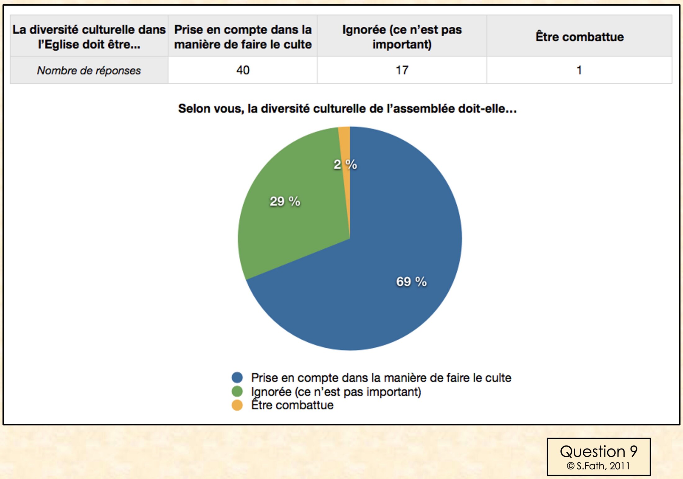 Ces chiffres confirment l'ampleur des mutations sociographiques vécues dans cette communauté depuis 25 ans. En matière d'exercice du culte, plus des 2/3 des répondants estiment que la diversité culturelle doit être prise en compte (question 9). En revanche, les 29% qui préfèrent ignorer cette dimension constituent une "minorité active" non-négligeable, à l'inverse du seul répondant qui souhaite "combattre" la diversité culturelle dans le culte. En matière de respect concret de la diversité culturelle dans la communauté, plus de 4 répondants sur 5 (83%) estiment la diversité culturelle "respectée et valorisée". Seulement 14% des réponses exprime une frustration ("pas assez reconnue par l'Église"). Est-ce parce que le consensus recherché par l'équipe pastorale atteint tous ses objectifs, ou parce que les mécontents ont tendance à partir (ce sont les satisfaits qui restent, et remplissent le questionnaire) ?