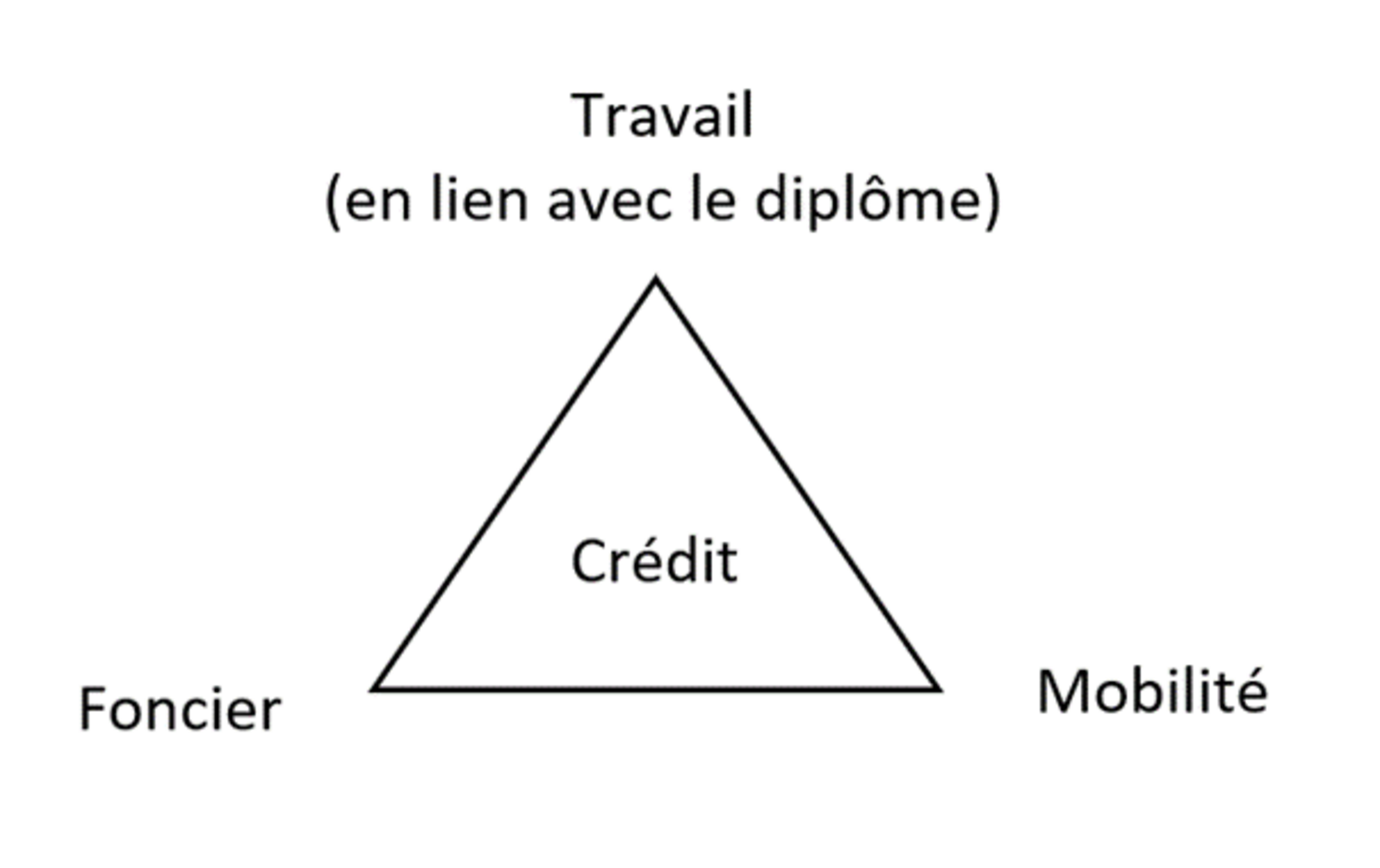 Ainsi, reprenant mon triptyque travail-foncier-mobilité, on comprend l’enjeu essentiel d’agir sur ces trois leviers en même temps, notamment pour desserrer l’étau du crédit, qui est prépondérant pour des personnes qui n’ont toujours pas de capital pour investir dans un logement et dans deux ou trois voitures. Comment se passer d’un crédit avec un salaire moyen ? On retrouve ici même les motivations du vote RN : de revanche sociale sur les classes supérieures (anti-élite économique et/ou culturelle) et de vote de distinction sociale sur les classes inférieures non-blanches ou ostracisées sous le nom de « cas-soc ». Ces électeurs sont des classes intermédiaires dont le lieu de vie est entre deux centres, socialement placés entre des zones où il y a plus pauvre que soit et des zones où il y a plus riche que soit.