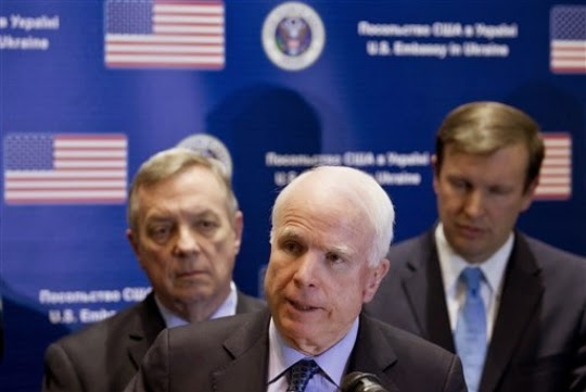 Depuis que le coup d'Etat à Kiev a eu lieu, ces faits déplaisants concernant les forces pro-gouvernementales ont été largement ignorés dans la plupart des médias de l'establishment US, seulement signalés par une poignée de commentateurs. En Janvier de l'année dernière, alors que le coup d'état était en plein déroulement, Seumas Milne du Guardian a fait valoir que le récit moraliste occidental sur l'Ukraine - les combattants de la démocratie contre les oppresseurs de Poutine -. "n'est qu'une caricature de la réalité" ["bears only the sketchiest relationship to reality"-NdT], "des nationalistes d'extrême-droite et des fascistes ont été au cœur des manifestations et des attaques contre les bâtiments gouvernementaux". La chaîne TV britannique Channel 4 a rapporté le rôle central joué par les ultra-nationalistes d'extrême droite dans ce coup d’État, notant que le sénateur John McCain s'est rendu dans la capitale ukrainienne (photo ci-dessus) et a partagé la scène avec les pires éléments fascistes. Justin Raimondo d'Antiwar.com a depuis longtemps mis en garde contre "l'ascension d'un véritable mouvement fasciste de masse dans les allées du pouvoir à Kiev ", notant que loin d'être une poignée d'éléments marginaux, "les militants des deux principaux partis fascistes en Ukraine - Svoboda et «Secteur droit» - ont fourni le muscle nécessaire aux insurgés pour prendre d'assaut les bâtiments du gouvernement à Kiev et dans l'Ouest de l'Ukraine."